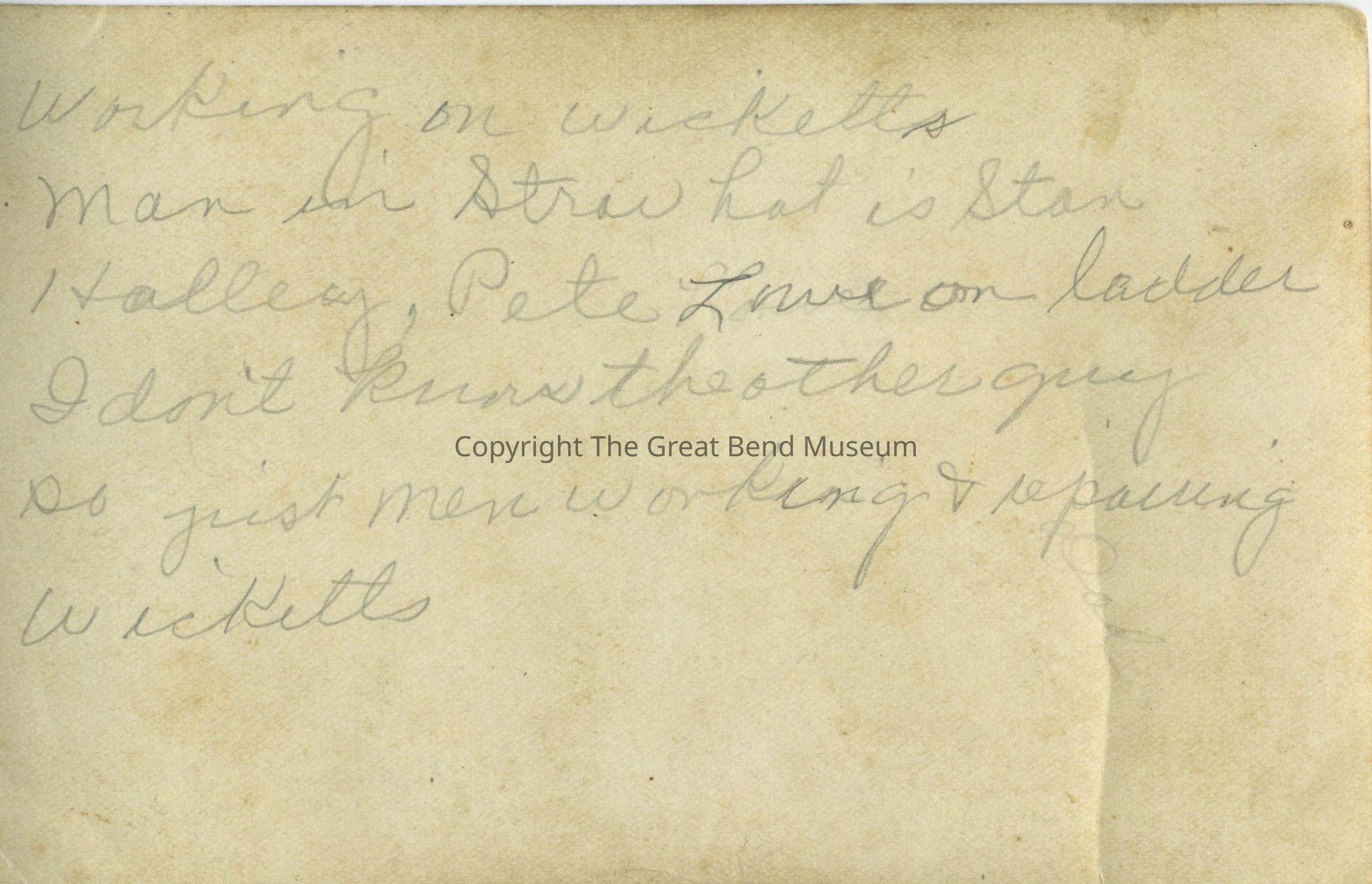 Working on wickets. Man in straw hat is Stan Halley. Pete Lowe on ladder.Photograph Details