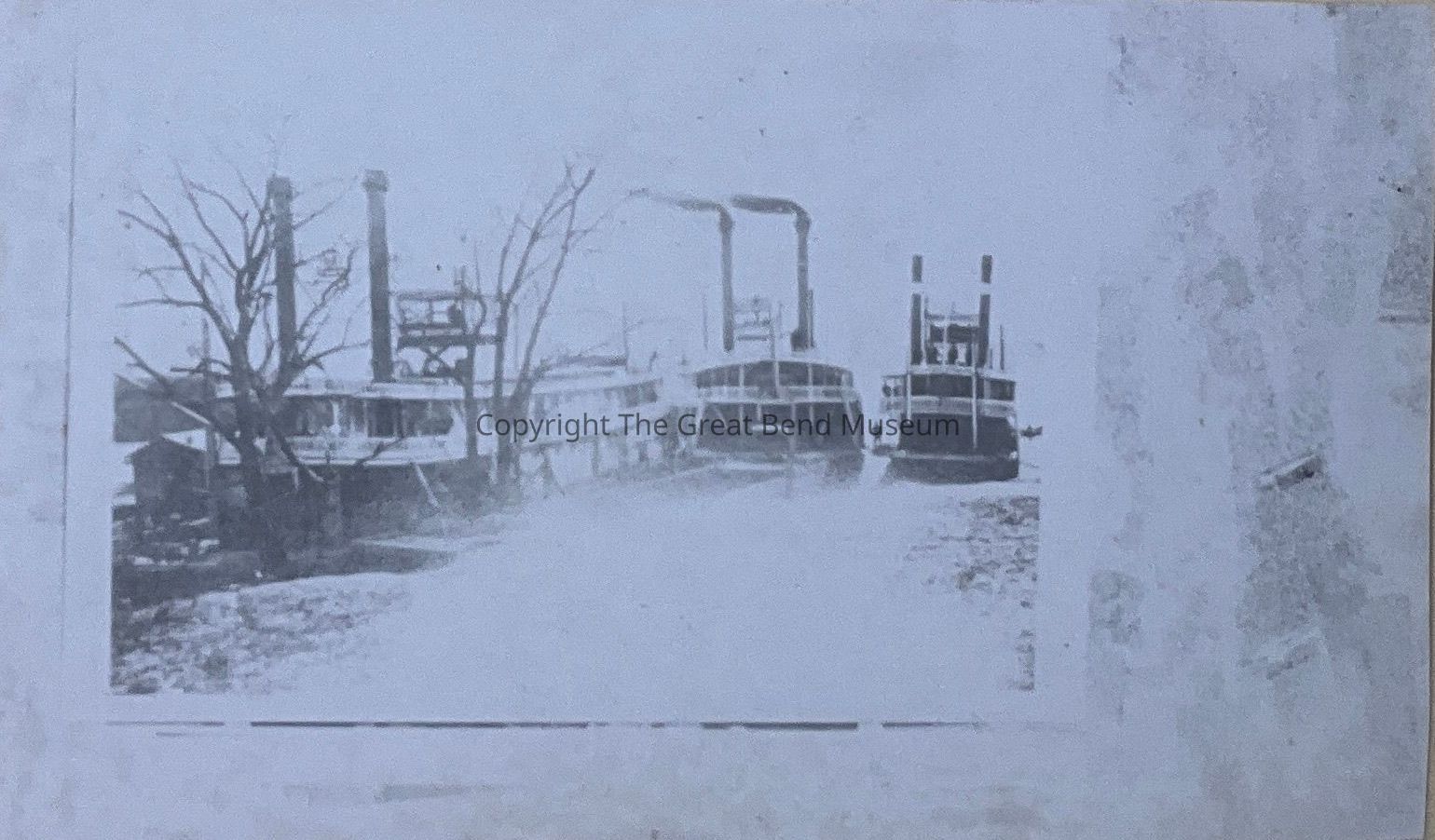 Photo - 1920's of the wreck of the H.M. Hoxie. Photo shows the steamer crashed onto the bank on the left. Two other steamers are to the right of the Hoxie - Photo is looking face into the boats. Steamboat wreck at________ StreerAcquisition