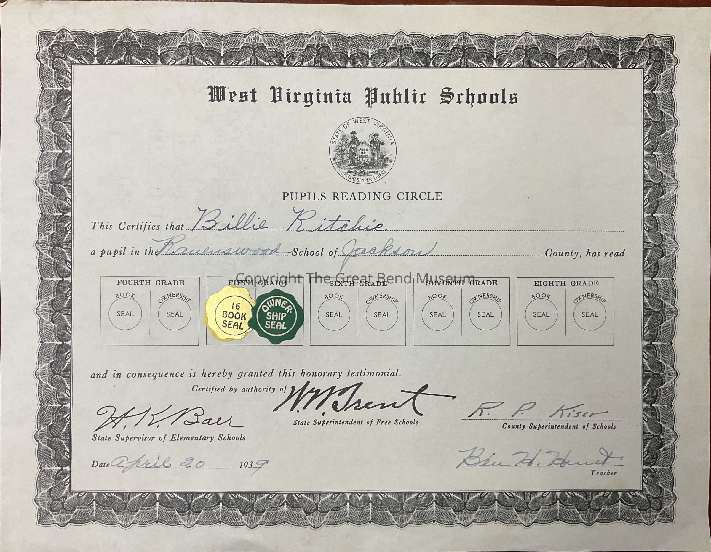 Billie Ritchie’s 5th grade reading circle certificate