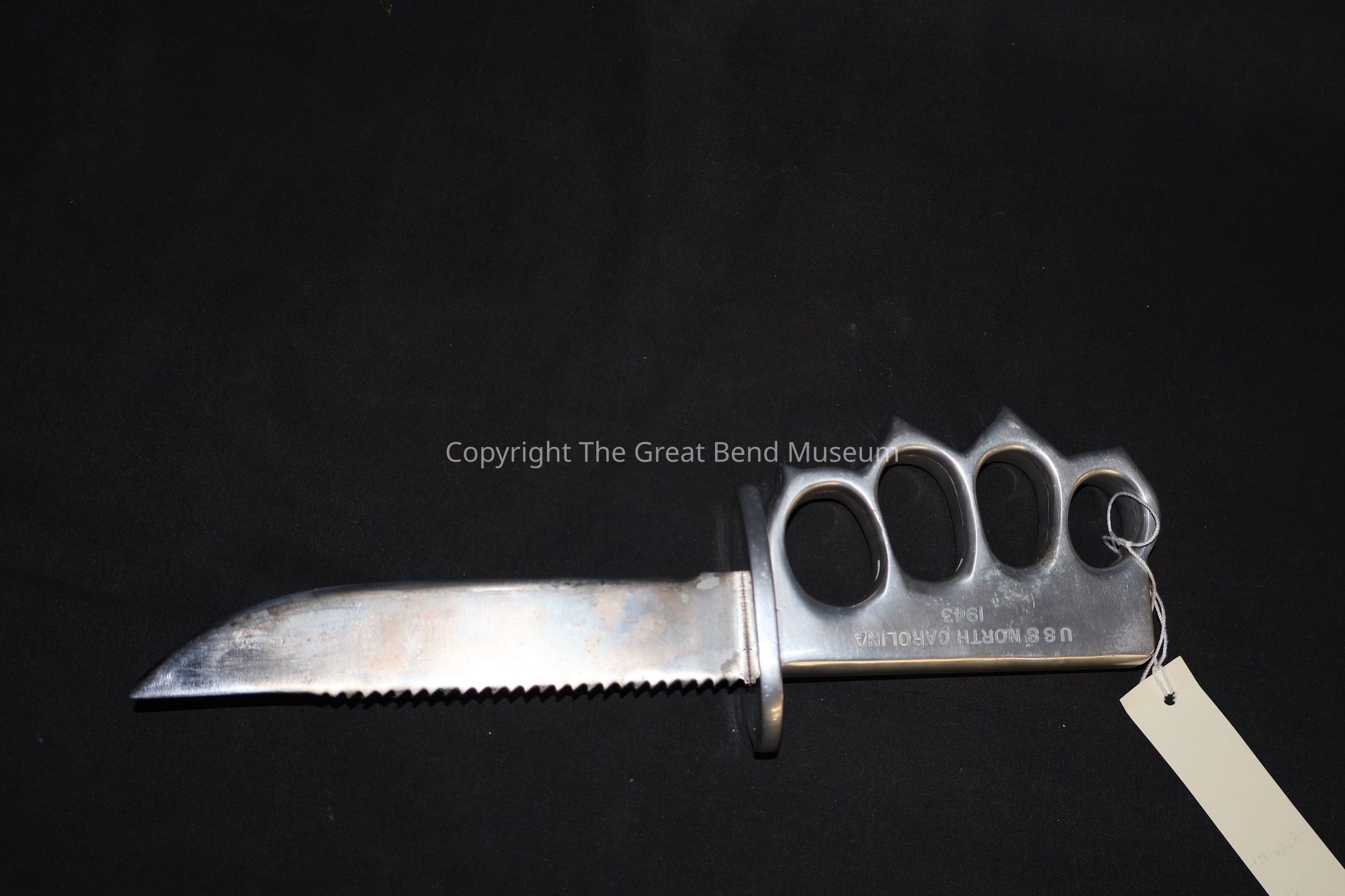 Knife was made from a broken power saw blade - stainless steel with serrated edge, shiny, clean. Handle is made from solid piece of aluminum with carved holes for all 4 fingers. Very smooth and polished. Handmade case tooled from leather with dog tags attached in the front with blue and white wire. End of case is squared braided leather tassel. Handle stamped USS North Carolina 1943. Knife was made from broken hacksaw blade and stock aluminum and carried on the battleship USS North Carolina during WW2 by W. A. Watkins. Was on Jesse's Run and grew up on Cavin Fork(?).
