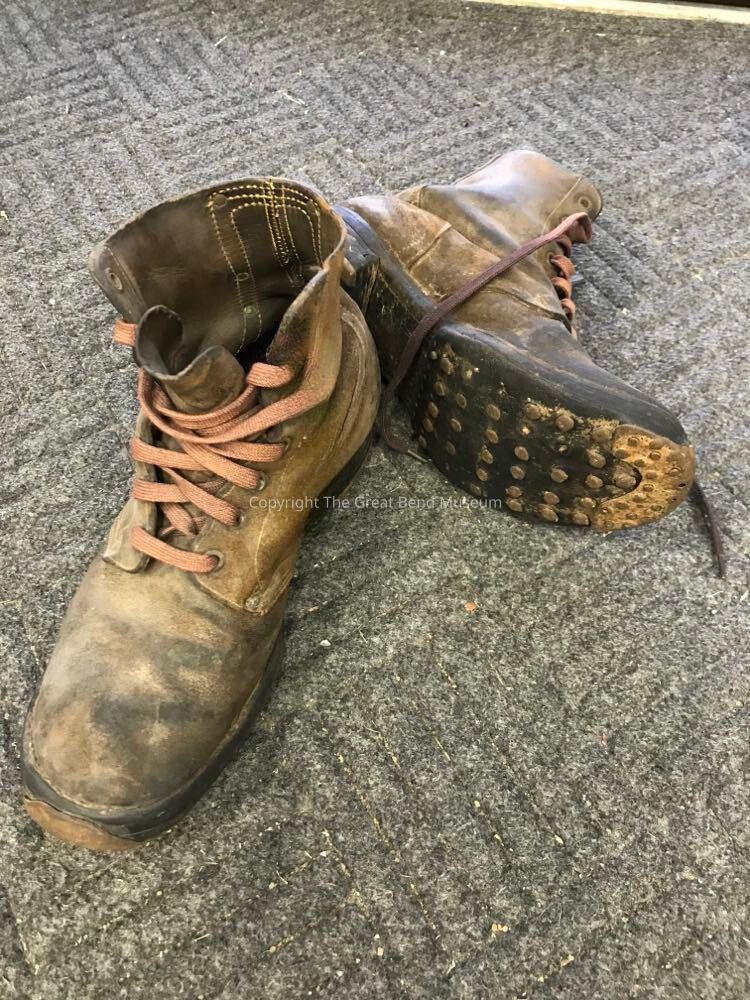 Pair of combat trench boots worn by Pvt. Kenna Seward 132nd Ifr K, discharged from Camp Meade MD 5-24-1919 WWI. Worn in the Argonne Forest battle. Brown leather with brown laces. Metal reinforced heel/toe, metal hob nail studs all over sole. Size says 7 1/2 ee. Left shoe has hole above the heel.Acquisition