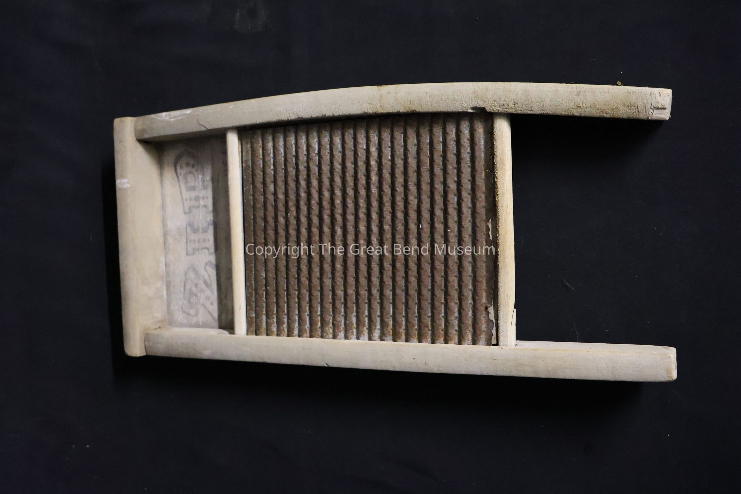 small wooden (grayed) washboard - possibly advertisement. Made by Badger Woodenworks co. - printed on top. Along with the "Zip" in black ink. Back has "W" "1331" and "Badger Woodenworks Co, U.S.A." one leg is bowed into the center, metal scrub part is very rusty. It's tacked together and top has a dove joint for the flat top.Acquisition