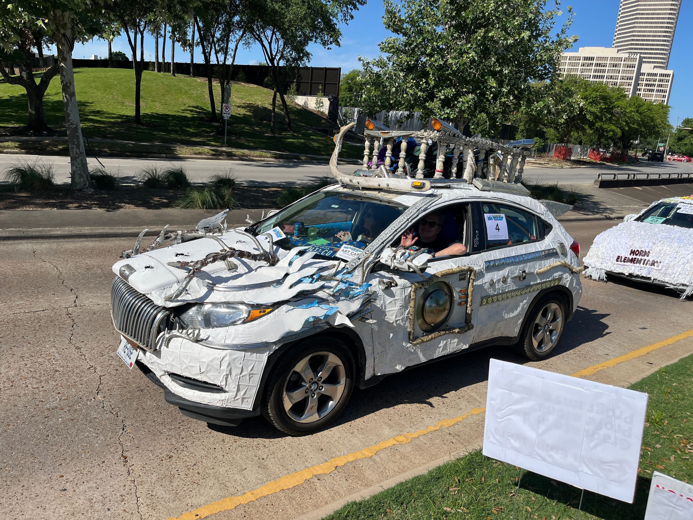 "“PhilCo” is my 7th ArtCar since 1983. The name refers to both my first name and the radio & appliance company. PhilCo (short for the “Philadelphia Company”) was an industrial stalwart through both World Wars before being bought by Ford in 1961. I’m originally from Philadelphia. An appropriate moniker, therefore, for an ArtCar built from an assortment of mid-20th century automobile and appliance parts. Bones and horns burst through the metal skin of this ArtCar. 125 years of manufacturing history can’t suppress the organic nature of this beast. PhilCo boasts a widow’s walk, a giant rib-bone spoiler and 3-D steel flames outlined in neon. It’s hood is a 70 year-old, shot-up fridge door. It’s been to Canada. It’s been to Mexico. It’s driven over the Rockies and now it’s driving on Houston streets"