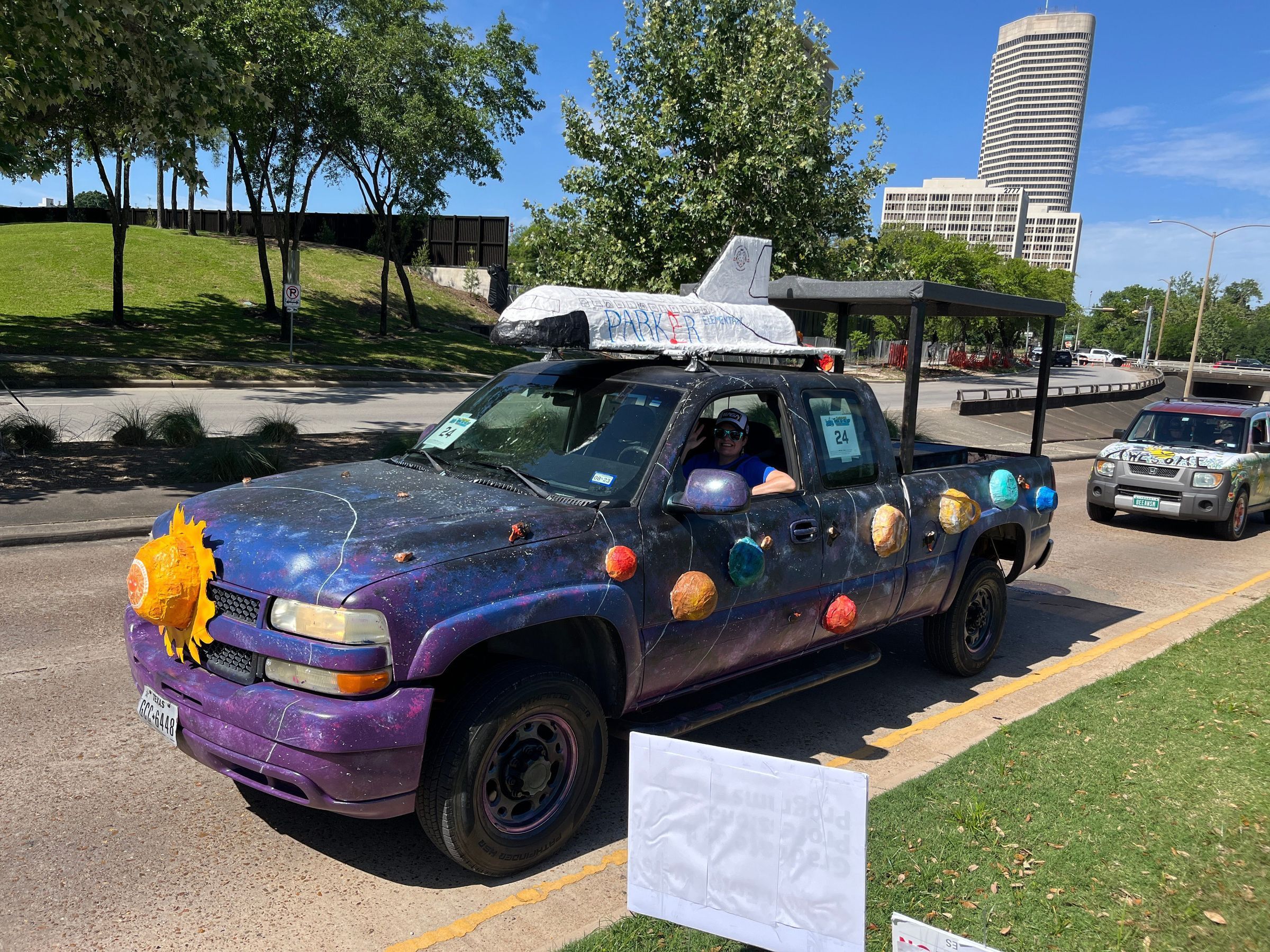 Inspired by astronaut Shannon Walker, a Parker ES alumni. Students painted the car with a galaxy design, built a space shuttle for the top, and planets to attach to the side. New neighborhood library opening this year, named for Shannon Walker, in honor of that, create car around her, and YES, that is her riding in the Galactic Walker with the Parker Elem Music Magnet School Band. Truck base donated by grandparent of student
