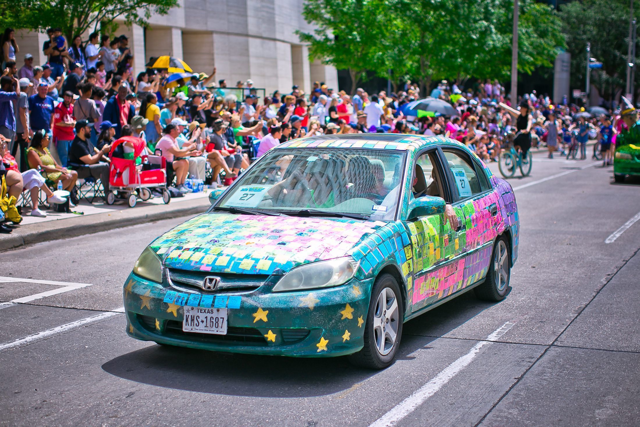 Our elementary school has participated in the Art Car Parade for many years and they are thrilled to complete this new design and showcase their work
