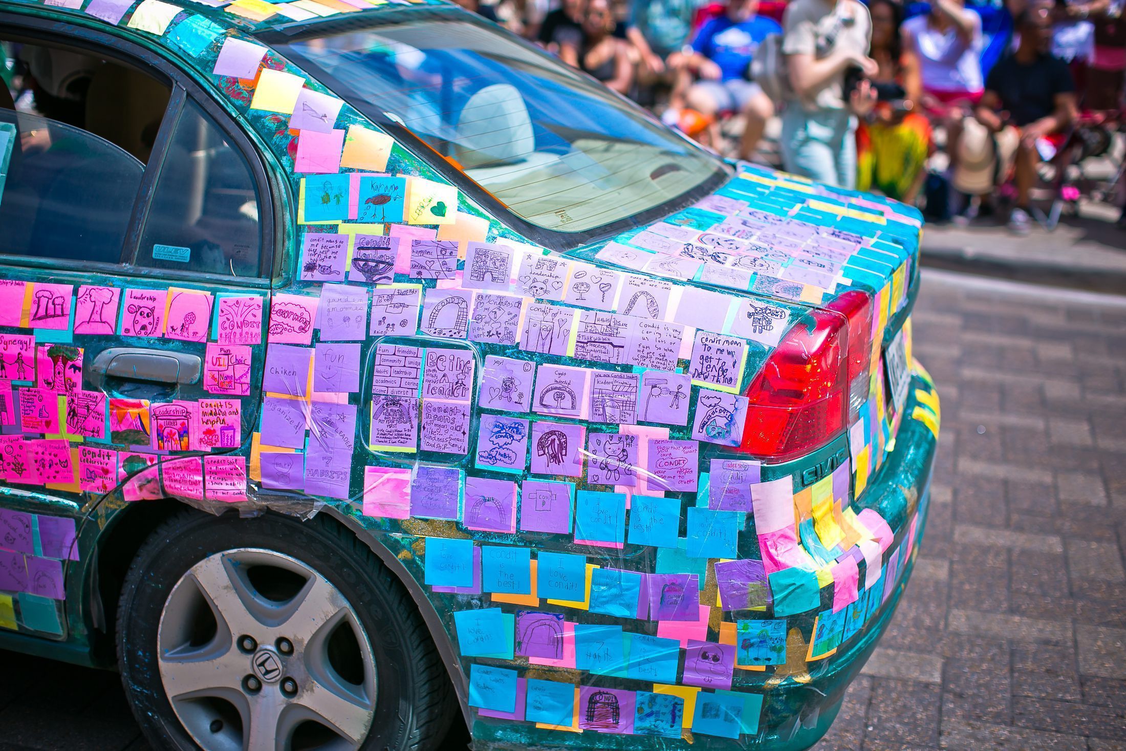 Our entry is covered with laminated post-it notes in neon colors that each student, faculty and staff member have designed . These post-it notes are affixed to the panels of the car. And since our school mascot is the cat, the car has cat ears, of coures!