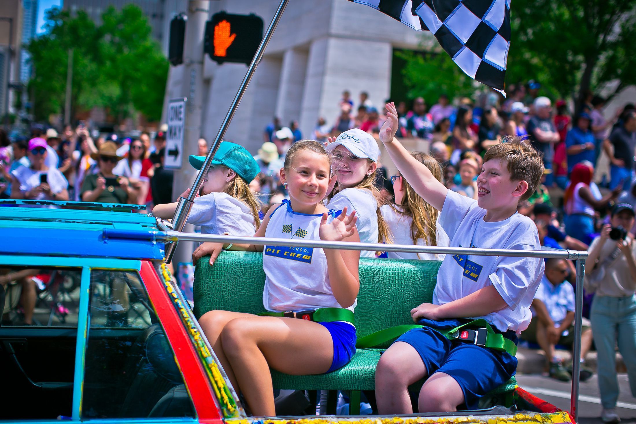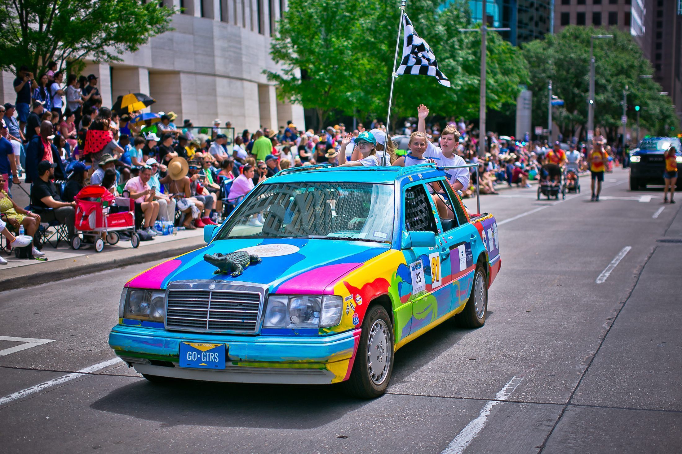 We purchased a 1993 white Mercedes station wagon and cut the back part off to add additional seating for kids to ride in the car during the parade. We are inspired by our school- The Fay School which backs up to the Buffalo Bayou. An amazing place to learn by exploring through nature on their 8.5 acres of property. We have chickens, gardens, and our mascot is an alligator!
