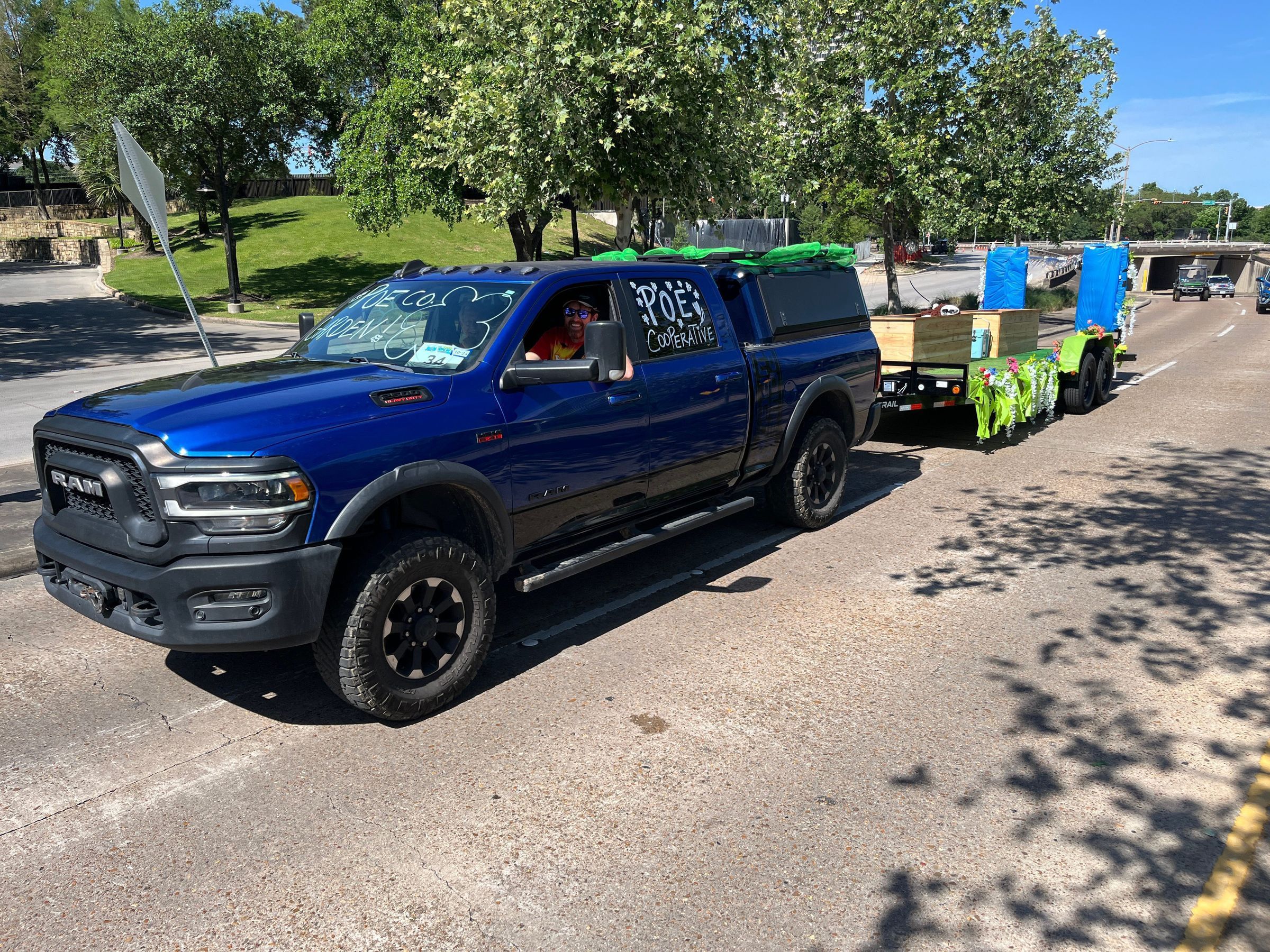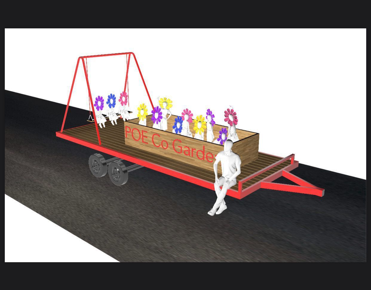 Poe Co is a child-centered program that aims to foster the love of learning through play. Poe Co is about community, creativity, and exploration - leading to social, emotional, physical, and intellectual growth. We are rooted in play based learning, and our art car reflects some of our favorite parts of our playground: grass with a giant flower box (filled with adorable flowers) and a swing. We encourage friends to use the swing during the line up. Made from AstroTurf, wood, metal, and lots of amazing paper crafts.
