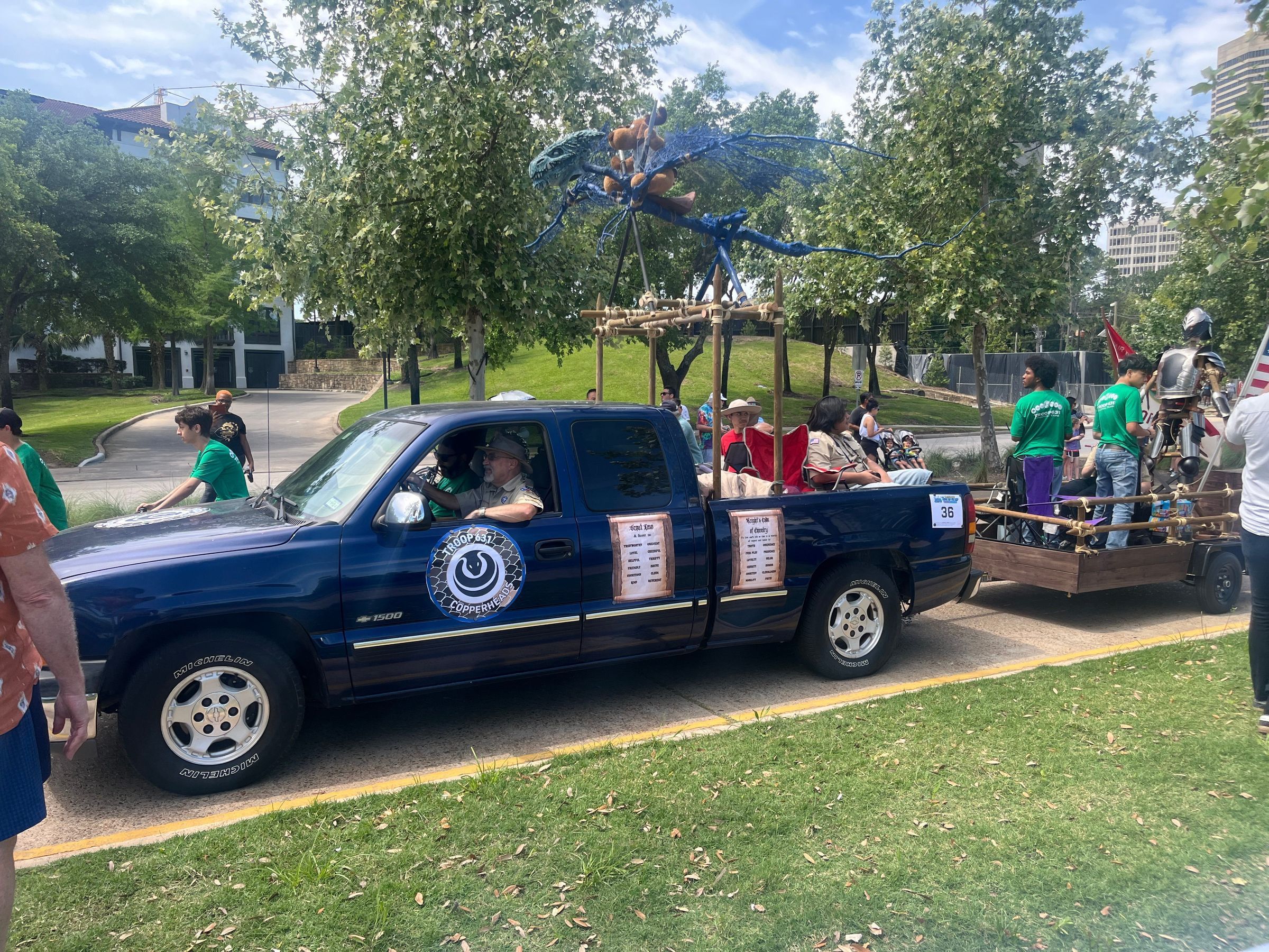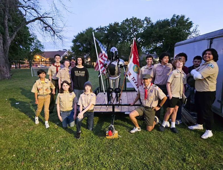 "Scout Troop 631's art car reflects their values of duty, honor, and helping others. They see knights, who swore similar oaths, as a symbol of being ready to help the community. Using their lashing skills, they created a knight and a dragon for him to face - showing their readiness to help people at all times.