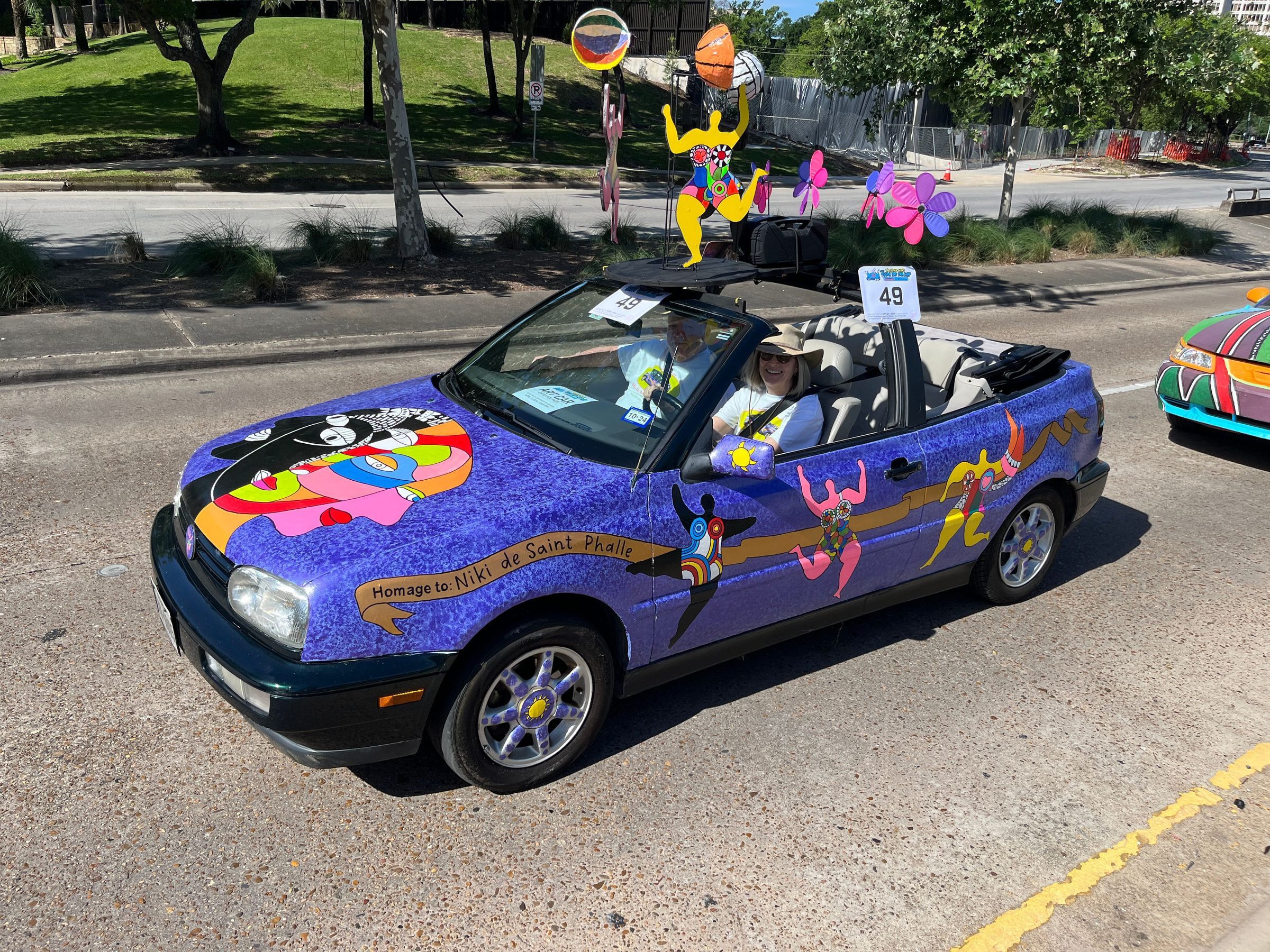 Each year, since 2008, we re-create our vehicle by preparing a tribute to a particular artist who is inspiring to us and whose art would fit into the spirit of Houston Art Cars. Our tiny VW Cabrio has celebrated many artists and genres of art including Gaudi, Monet, Hans Edelmann, Japanese Art, Charley Harper, Klimt, Alebrije Art, Yayoi Kusama, Keith Haring and Victor Brauner. Many of the cars, such as this one were inspired by art we viewed at Houston's Menil Collection or by art we discovered while traveling. We begin by painting the entire car white, then proceeding to let the art of the honored artist spark our painting and decoration.