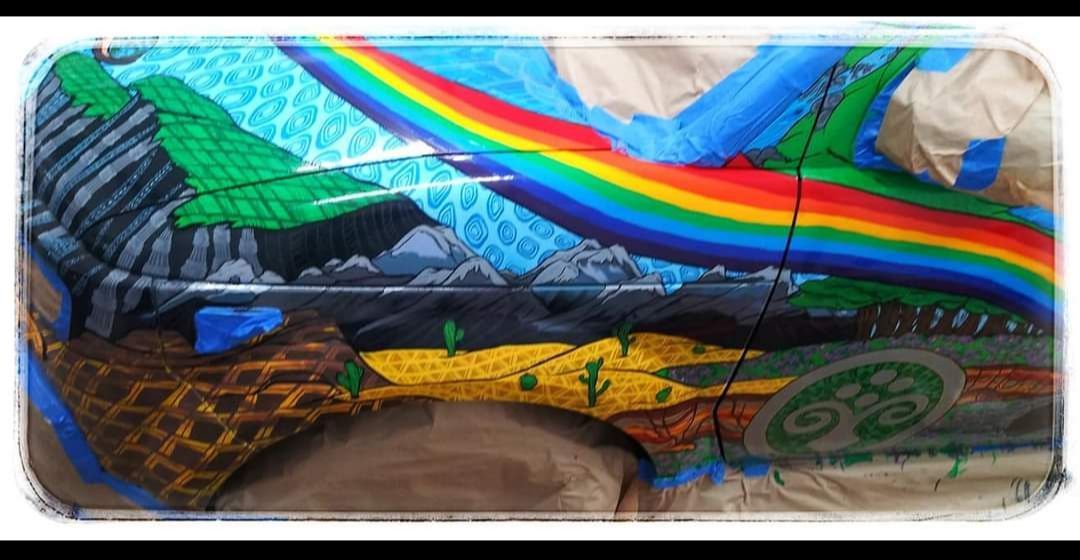 Elemental State of Mind is a Honda Element who is painted all over with the 5 elements and in this (work in progress) iteration, little mushroom buddies.