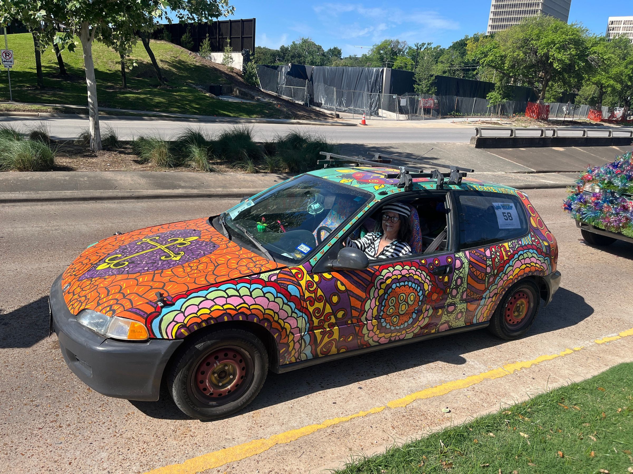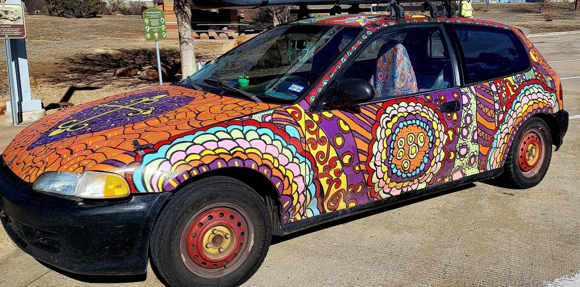 I've painted several vehicles and it just keeps going! I'm a single mom of 3 adult daughters who live across the country from me. Road trips are one of my favorite things. This adventure has lead to me becoming a muralist and allows flexibility to do what I want it life. Several years ago a car followed me off the interstate, and parked beside me A very excited young fellow sat in the passenger seat all smiles. He mom told me he was very excited about my car as he loved the Houston Art Car Parade more than anything in life! It's taken me 4 years to finally be able to come to a show. My hopes are that if just one person sees my work and it inspires them to be creative I have achieved my purpose in life.