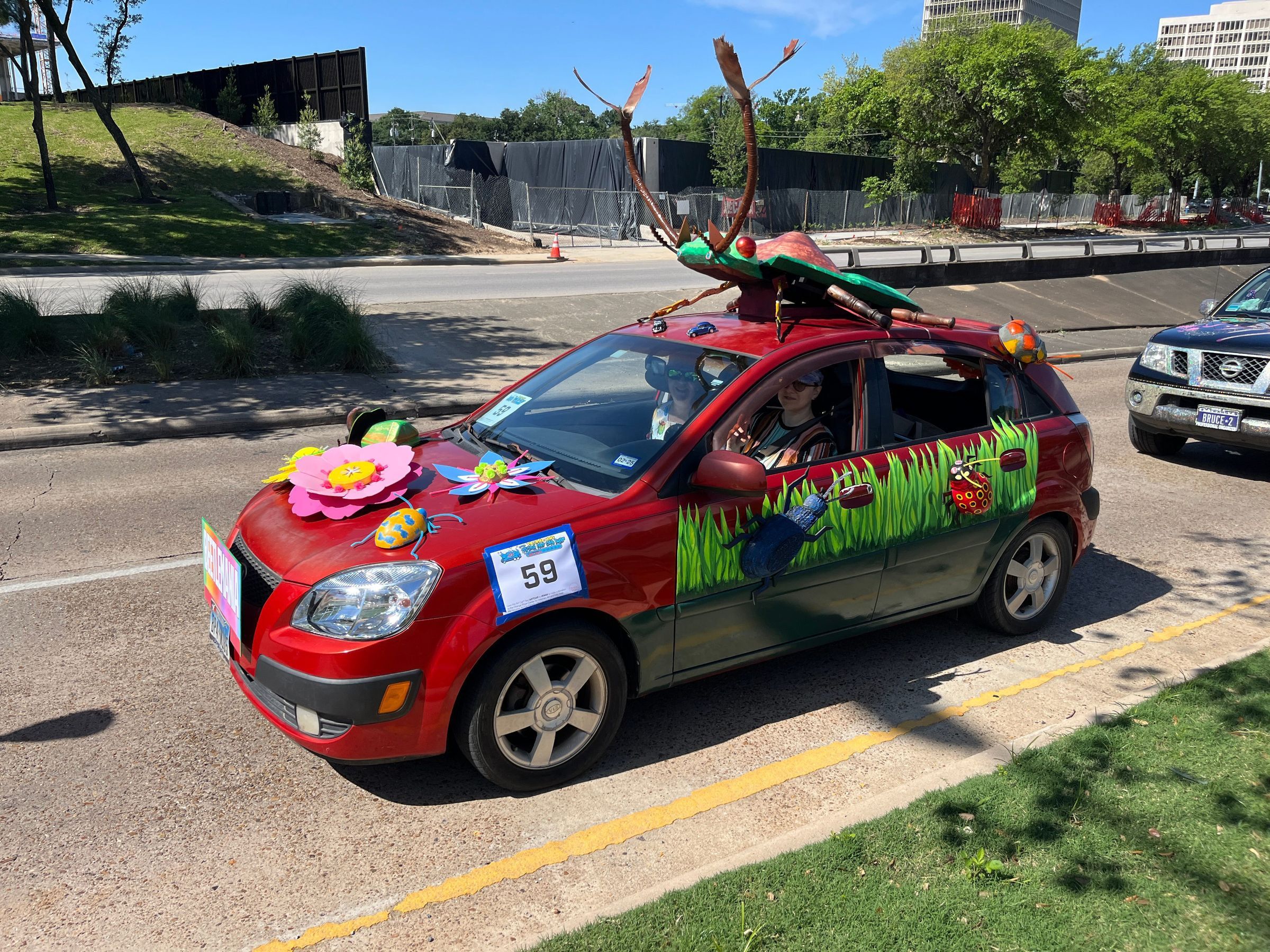 A small red hatchback has been invaded by Beetlemania! The side panels sport a grassy habitat painted on magnetic vinyl panels infested with many colorful beetles actually found around the world (but on steroids!). They swarm the car that is topped with an impressive staghorn specimen in a stunning pose, built from papier-mache, mixed media, and found objects. The artist/driver has an equally notable bug-decor outfit to celebrate the day.