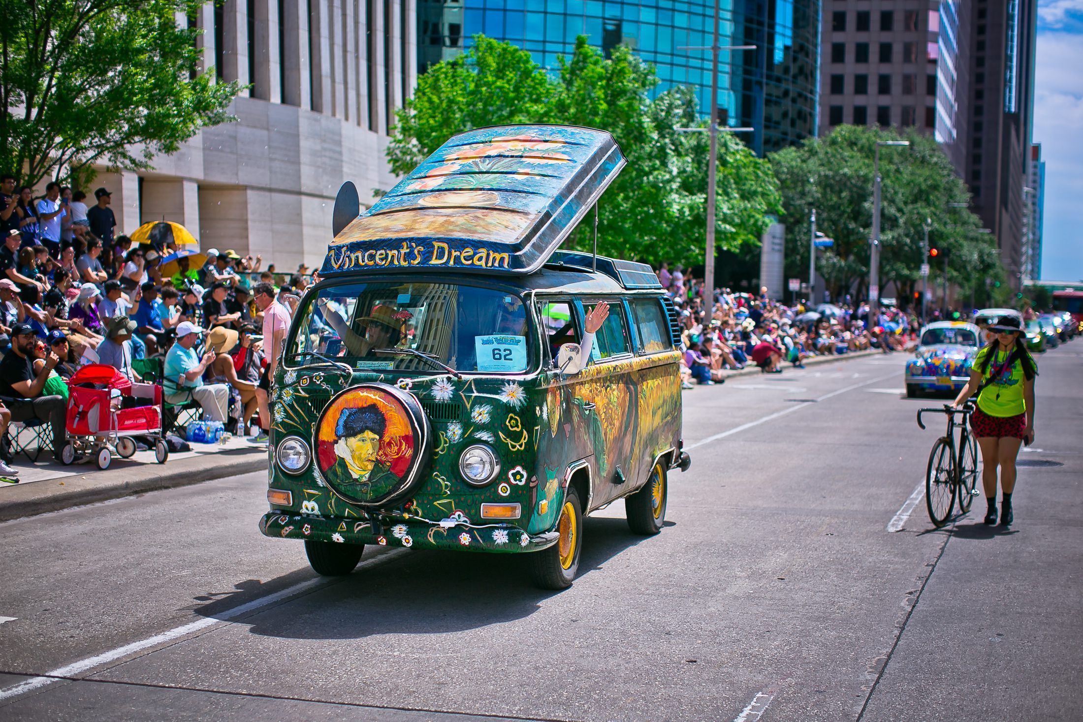 "Vincent's Dream was created in 2001 with a homeschool group taught by Sam and Nancy Jones. We acquired this 1972 VW camper van in 2000 for our art car project. As we studied about Vincent Van Gogh among the other Impressionist painters we were inspired by Van Gogh's zeal, energy, life story and his works. The finished art car is an art lesson on the most iconic work of Vincent Van Gogh.