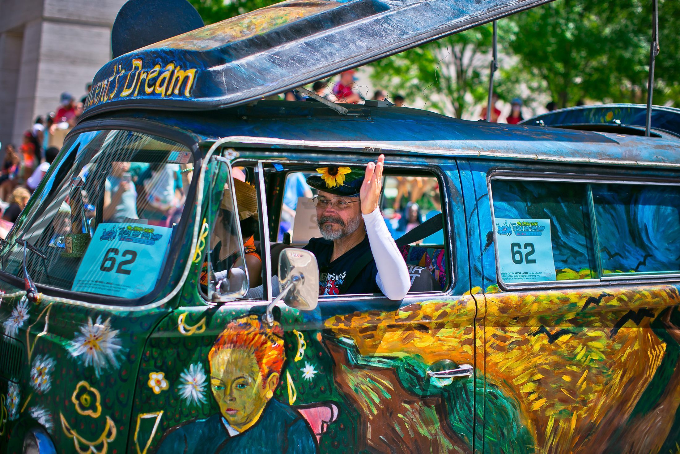 As educators of visual art, we were exploring different venues to show off our students' artwork. We participated in creating an art car with our church in 1997 for the parade. Also, with Sam's art degree in sculpture and Nancy's design degree, we wanted to create 3D art with our students. The Art Car Parade has provided the perfect venue to show off our numerous wheeled creations over the years! We enjoy seeing old friends and making new ones around Parade time and throughout the year at different events, even in other cities!