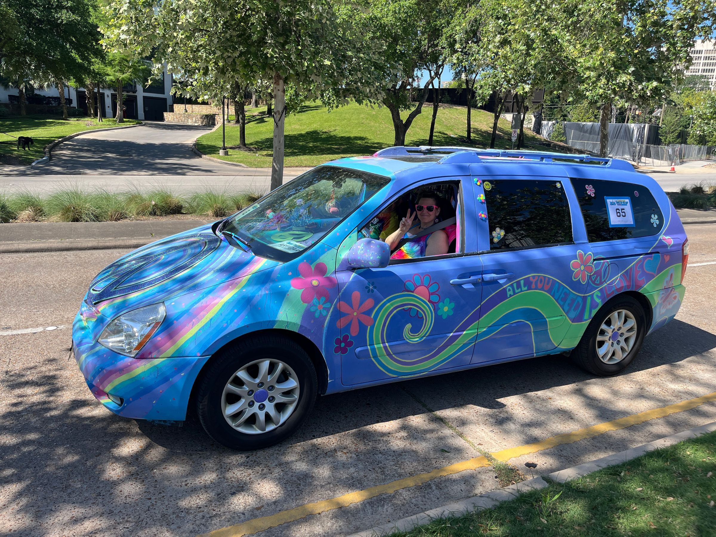 "I always wanted to paint a van. I don’t know why, because I missed the real hippie generation (born in ‘67 to non-hippie parents). This hippievan is the sixth car that I have painted. It is brightly colored with rainbows, flowers, peace, signs, and a tornado swirl in the back. 8-year-old girls LOVE this van! ""All You Need is Love’ is written on the driver side and the words Freedom, Empowerment, Justice, & Peace & Groovy are on the passenger side.