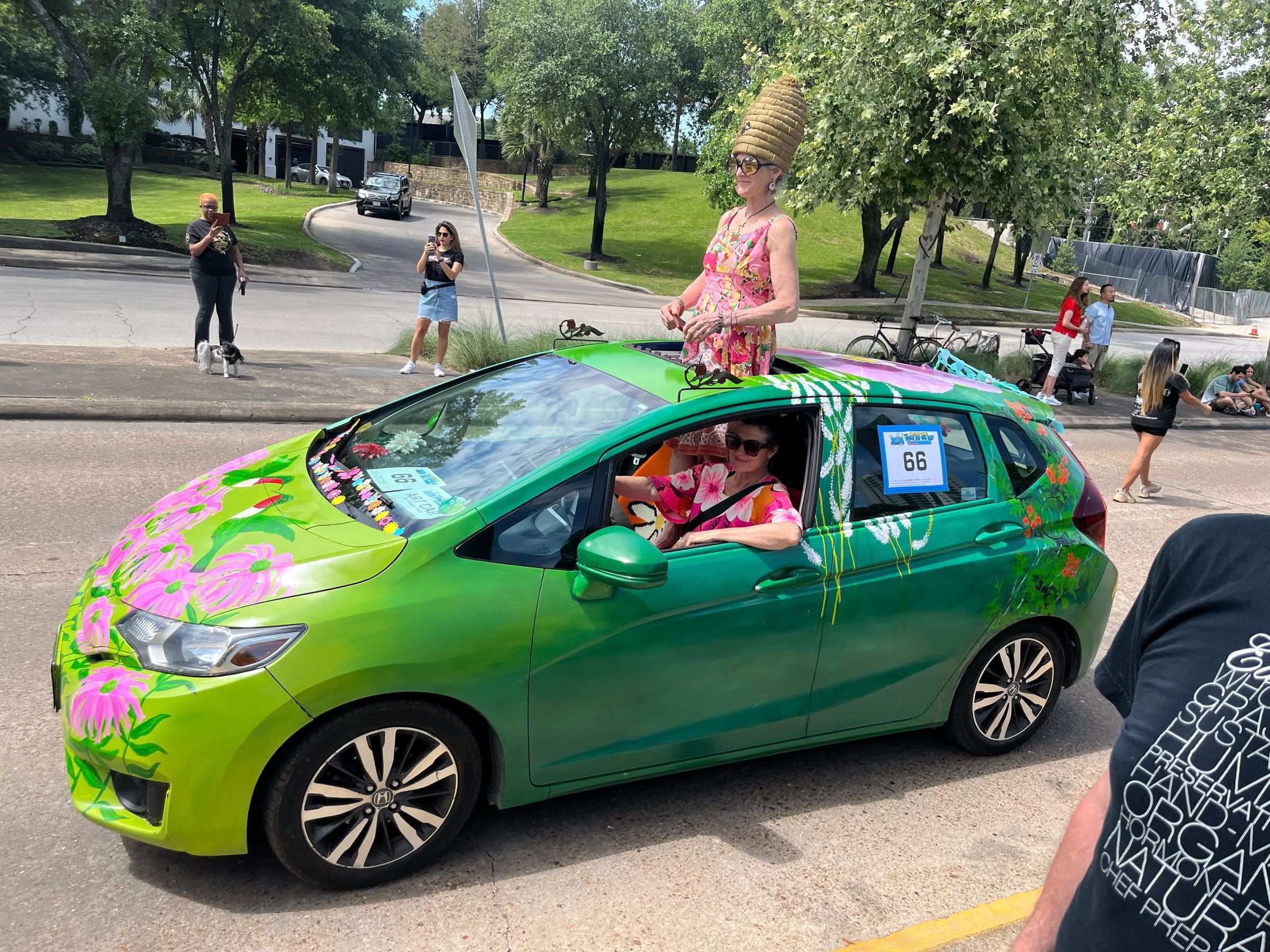 Why I made an Art Car? I was hanging out with the Mpls ArtCar people as one of the bikers. When it got too cold to bike; I'm not a winter biker. I made a temporary ArtCar out of fabric. It was a hassle putting it on the car for events and parades and it faded and looked pretty shabby after a summer. So now I love driving my Pollen daily driver to give joy to anyone who sees it.