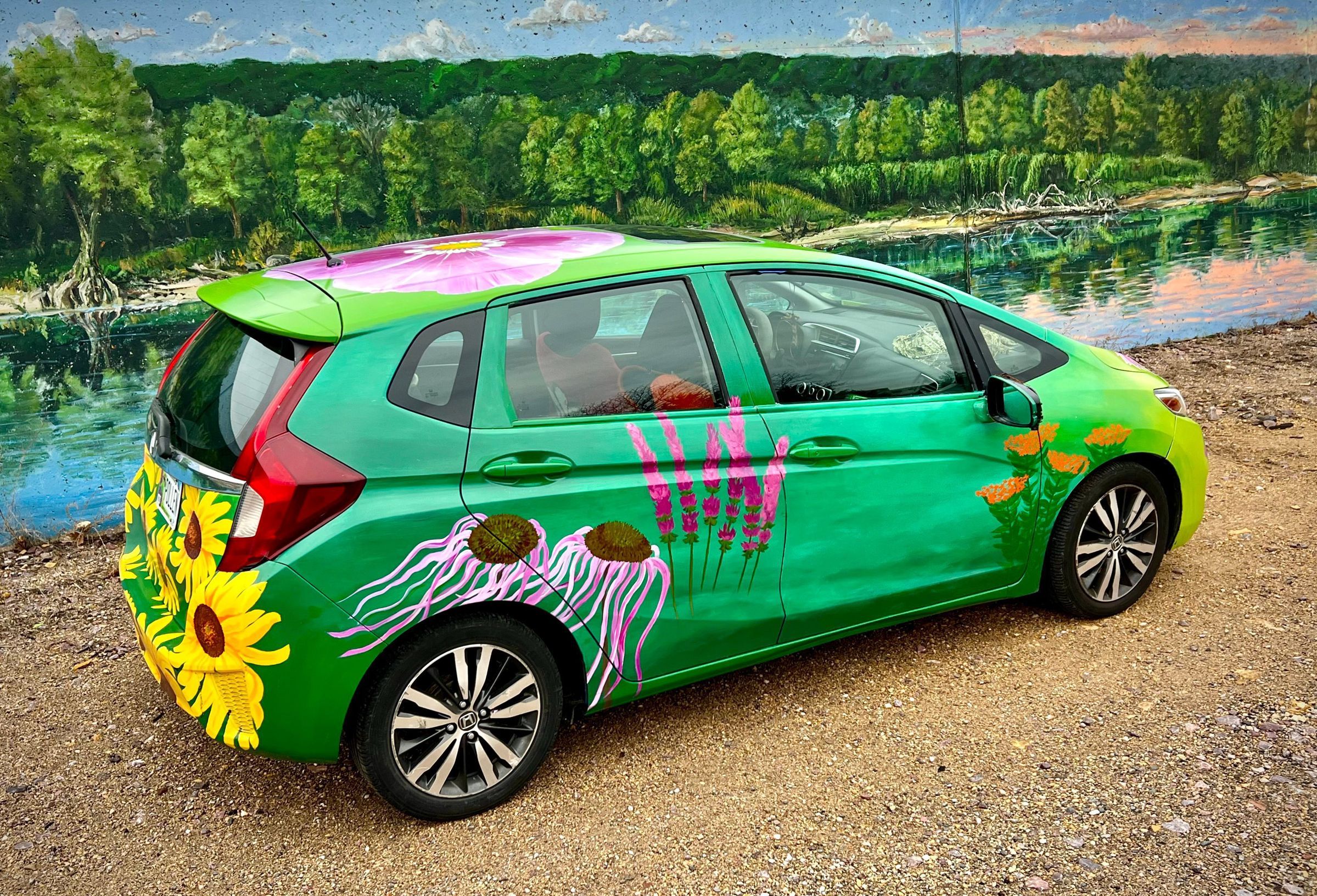It came time to renew my license plate and choose a personalized one. As soon as I put ""POLLEN"" my Honda Fit, it was to time to let the creative process begin. I sanded my blue Fit, primed it and now it's a growing Minnesota native garden to bring awareness to the public to add gardens to their properties. It has been so much fun chatting with people when they see my car. It is a traveling educational garden on wheels.
