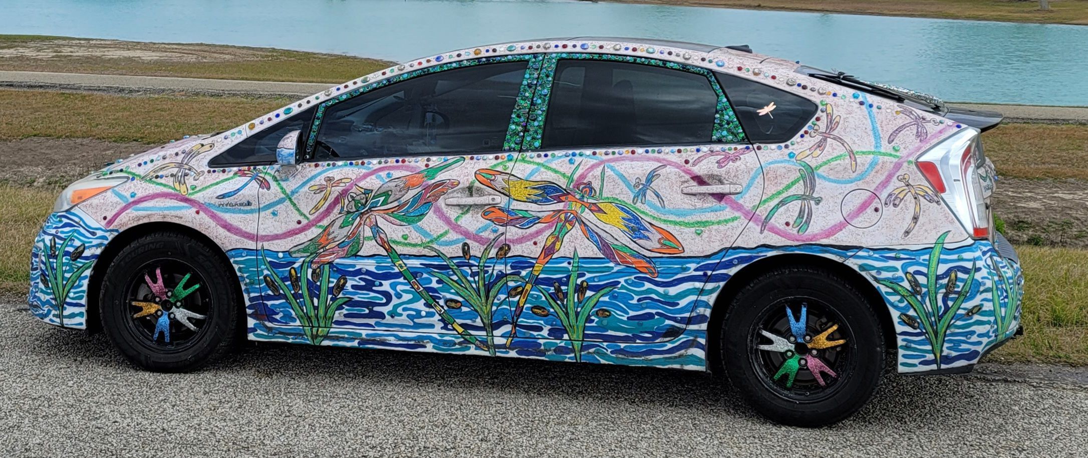 "The Dragonfly Whimzee is a hand-painted, award winning, 2013 Toyota Prius, ""dressed"" in whimsical colorful Dragonflies emerging from blue waters and cat tails. Adorned with glass marbles, glitter, and Dragonfly decals.