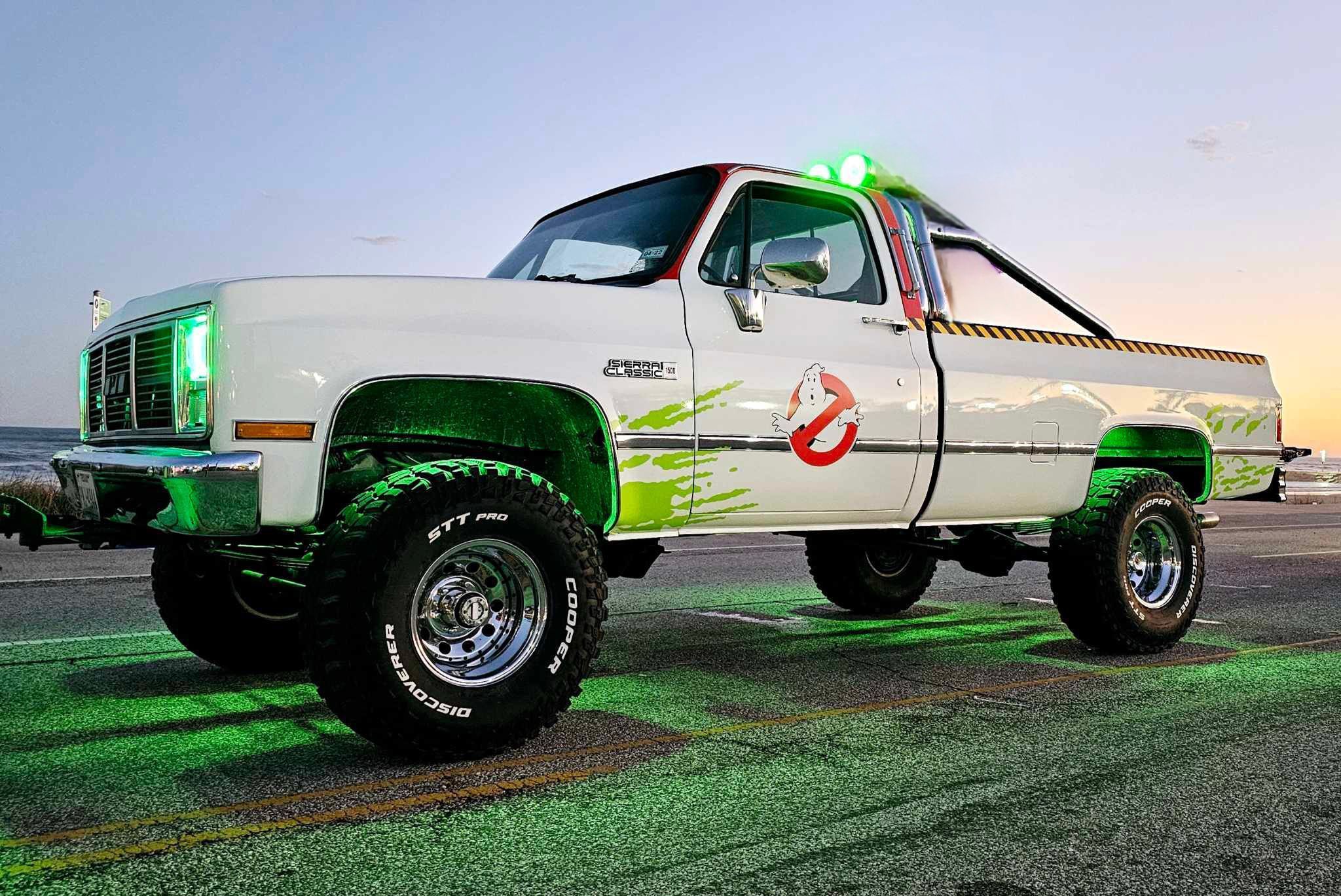 My vehicle is a 1986 GMC squarebody. It's a large 4x4 truck, long bed. It has a very 80's look to it with large tires, old school rims, and a roll bar with kc lights (sort of like the truck from the fall guy). The design though, is based off of the Ecto-1 from ghostbusters. White with red accents, green splatter behind the fenders, hazard lines, green lights, and the no-ghost logo on the doors.