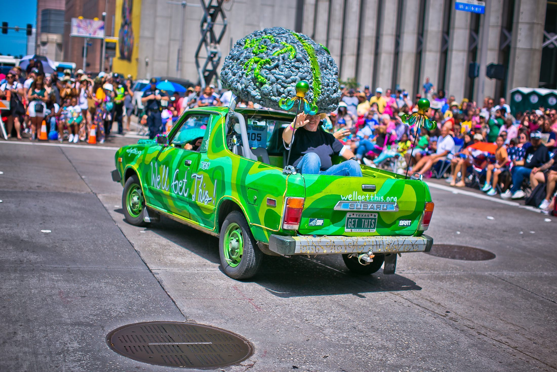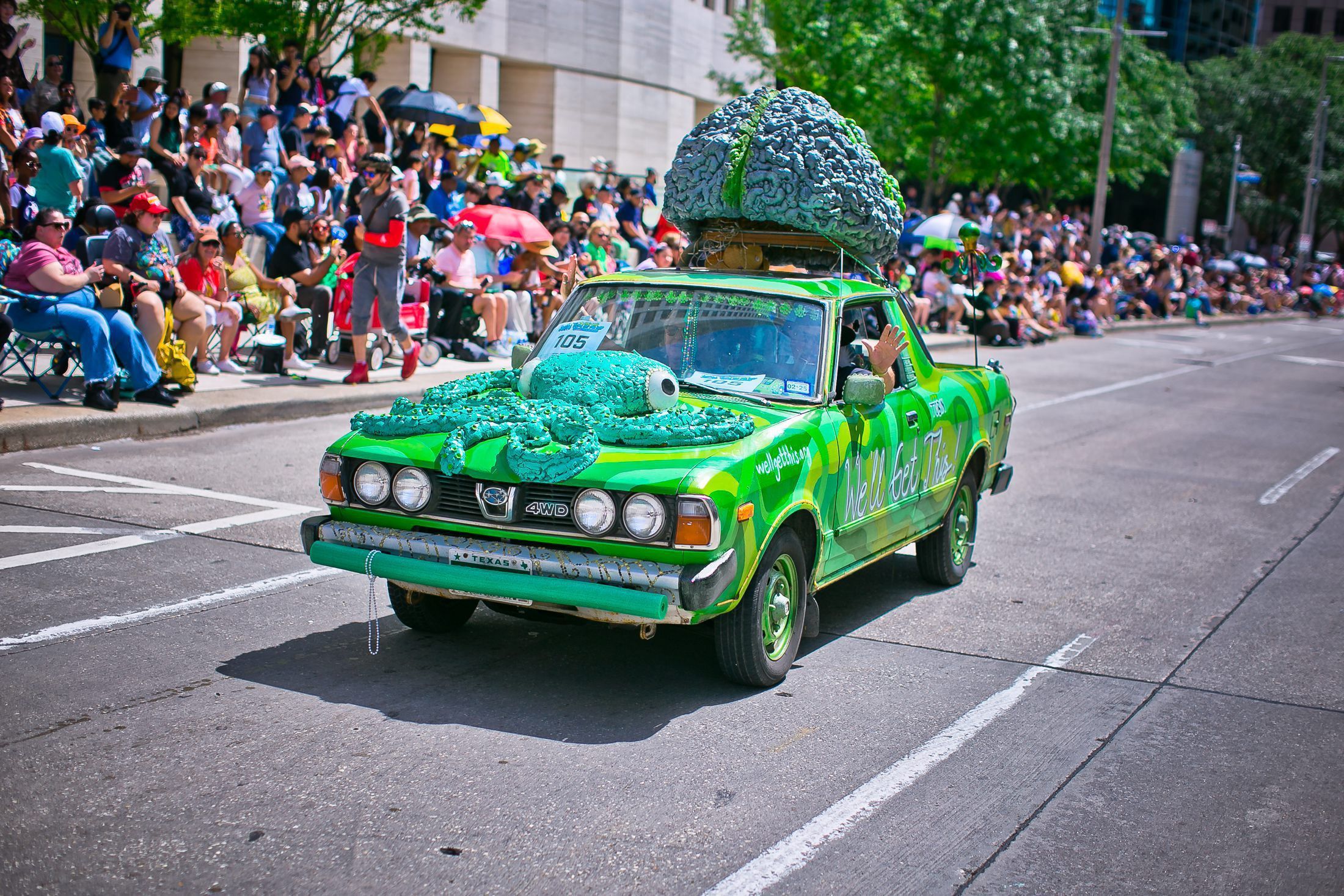 Our entry is a little 1979 Subaru Brat. She's painted various shades of green, because that was our son, Tobin's, favorite color. She has a spray foam insulation giant octopus whose eyes light up on the hood, because that was Tobin's favorite animal. It has an enormous blinking brain on top (17 cans of spray foam insulation) to represent Tobin's battle with brain cancer. Like all Artcars, she's always a work in progress. Once you start putting glitter on things, it's hard to stop!