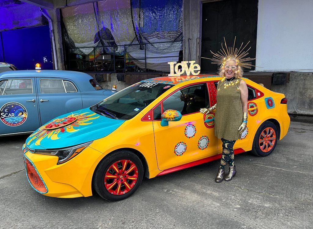 Everything on my cars is carefully thought out and has meaning. My second car for the project, PHOENIX RISING Art Car, was born out of my HUBBA HUBBA art car catching on fire in Phoenix, AZ! So the story of the Phoenix bird has been central to my creations. The cars following PHOENIX RISING were also Phoenixes. The LOVE IGNITES! mobile was a re-working of PHOENIX RISING because I felt she needed a new identity that would closer align with my vision for honoring my brother. That car won First Place in the Art Car Parade 2022.