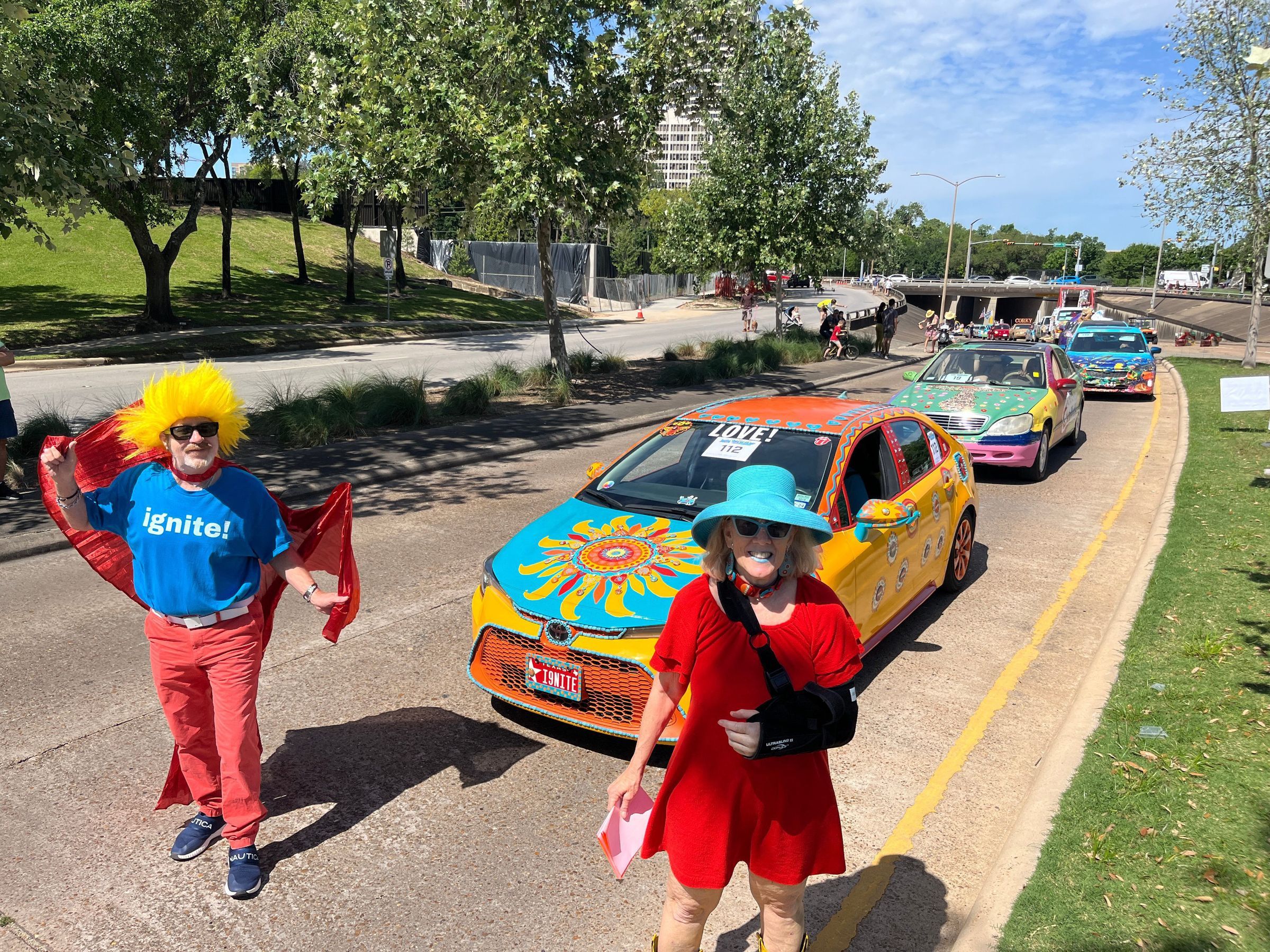 I started making art cars because I'd been around the Orange Show since the 1990s -- volunteering and doing workshops and going to events (I won the "Lucille Ball Look-a-Like" contest once -- my competition was a dog...). I took my family and friends and kids to art car events but never felt I could make an art car because I wasn't a "real" artist. But after totaling a car, I was gifted a 1995 Toyota Tercel and in 2003, I turned that into my first art car. It didn't live long (less than a year) but I was HOOKED! I have loved making art cars ever since.