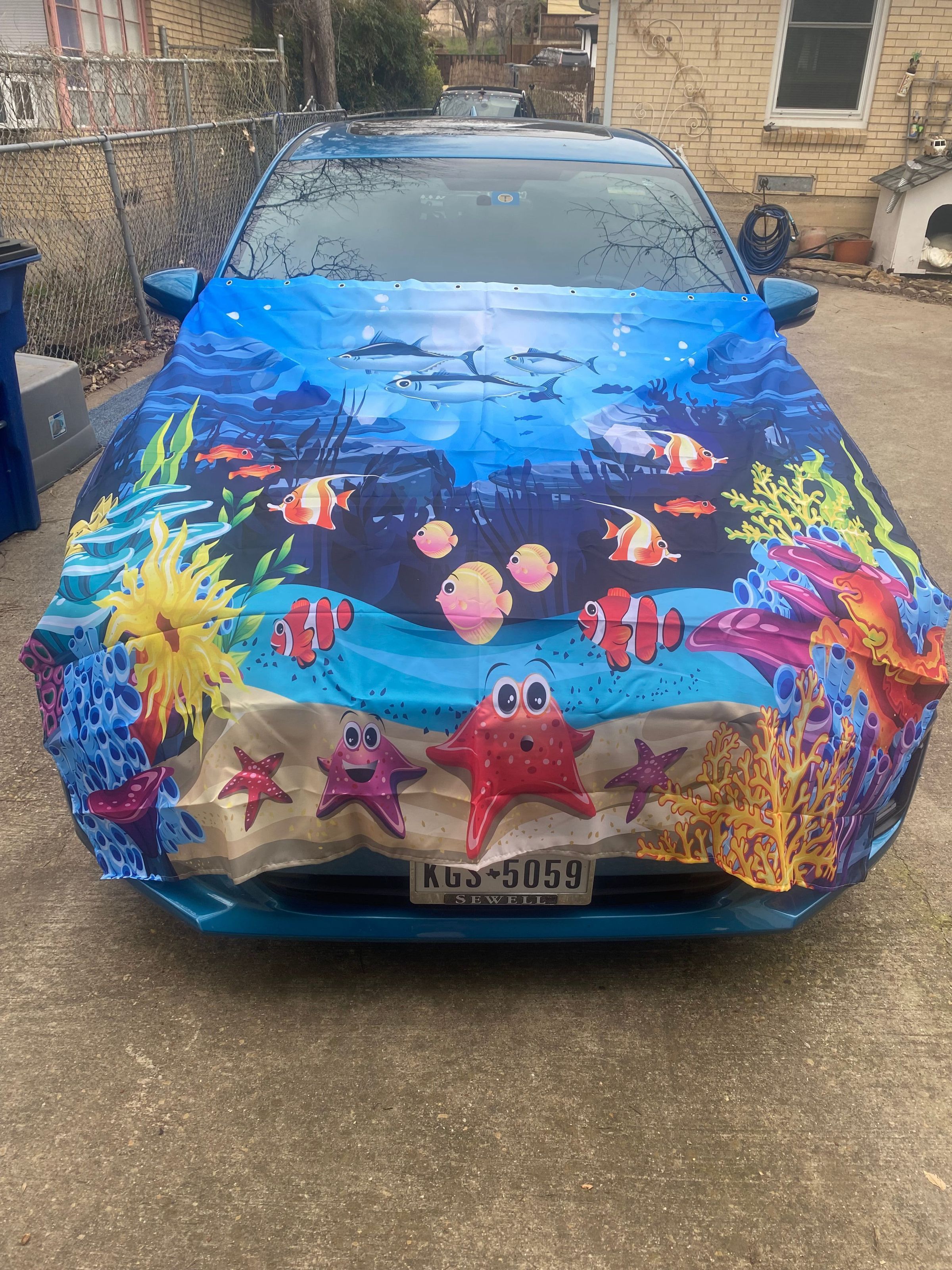 I am going to custom cut 6 or more ,if needed , coral reef shower curtains to fit and drape over the body parts ( hood , 4 doors ,fenders , the back hatch ) of my 2017 Subaru Impreza 5 - door . I will use X -Acto knives and scissors to cut the vinyl and fabric shower curtains and adhere them to the auto's doors , hood , fenders and such with clear packing tape on inner surfaces of the entire car to deliver my message and creativity