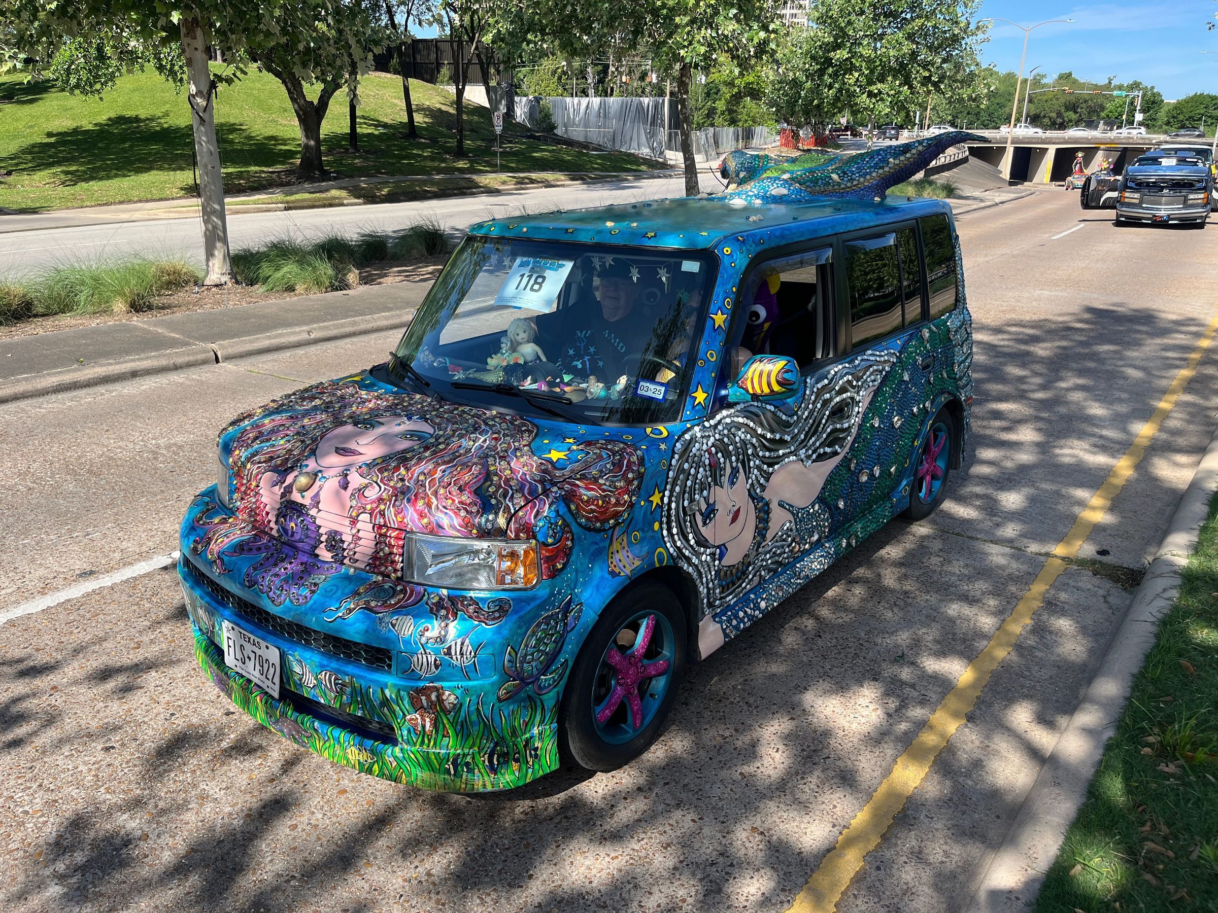 I went to my first art car parade in Houston in 1998. I walked the line and at the end of the line I decided I was going to do a car. I had NEVER done art and couldn't paint in the lines or draw at all. I didn't want to decorate my daily driver so I purchased 1958 VW bug. I am an intuitive so we covered the car with tarot cards. The next year I decorated my daily driver and she became Peaches on the Beaches. I continued the art car path by doing three more cars and decorating my house to excess. Once I got the wild creative bug it stayed with me. The painting of the cars and the drawing has always been done by someone else with my overbearing art direction and me doing some repainting on rare occasion. I provide the vision for the cars and know what the end result should be. I am, however, the glue master. I have done almost all of the adhesive work on all my cars. I am no longer afraid of holding a brush with paint but I still don't draw or live in the lines. As always, I love the Main Street Drag. It has on more than one occasion brought me tears. It is moving to see joy. There is nothing more special that I do all year than see the faces of those we see on Main Street Drag day.