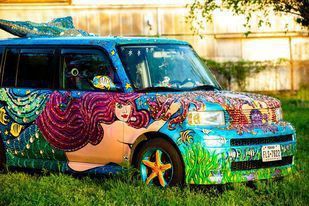 I love mermaids and the ocean. Mermania has three mermaids and a painted ocean scene in the back. there is a mermaid on each side of the car and the face on the hood of the car with her tail coming off of the roof. The tail is made with chicken wire, bondo, styrofoam, and fiberglass. The rest of the car is painted and bejeweled with various materials.