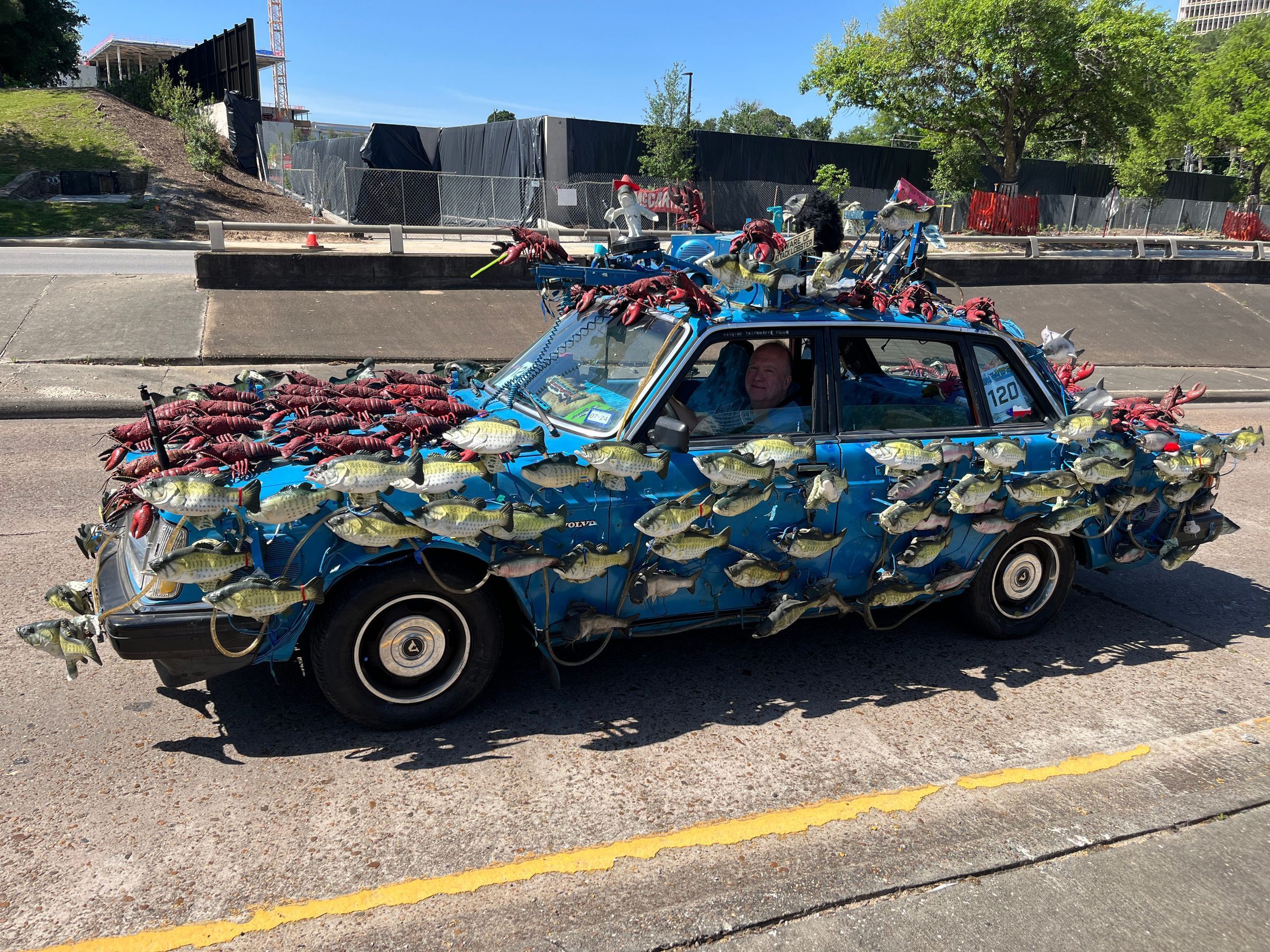The Sashimi Tabernacle Choir is a Volvo covered with 250 computer controlled animatronic singing fish and lobsters, performing drive-by concerts when you least expect it. The Choir performs everything from rock to pop to opera, and is energetically conducted by a lobster formerly known as Larry. A frequent entry to the Houston Art Car Parade, this car was the 2017 winner of their first ever Hall of Fame Award.