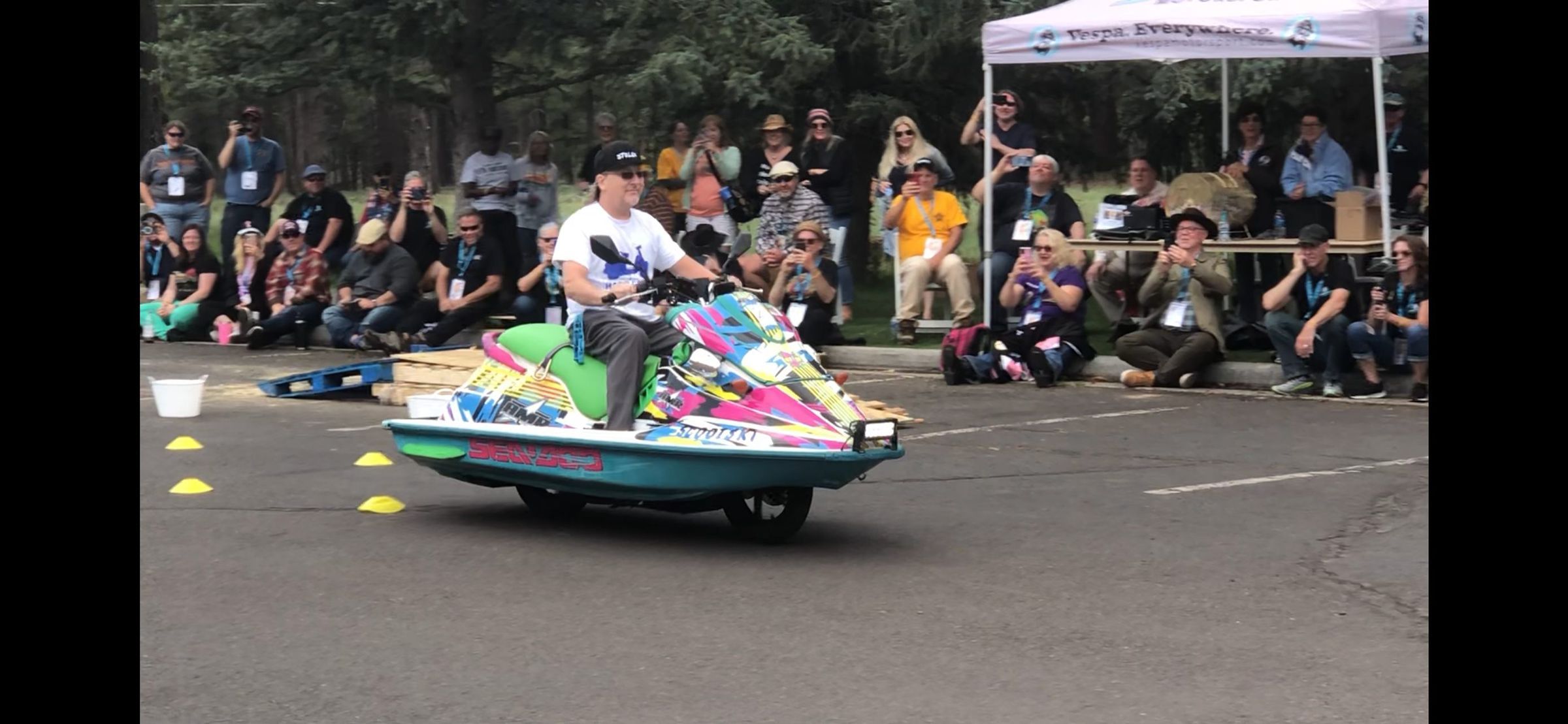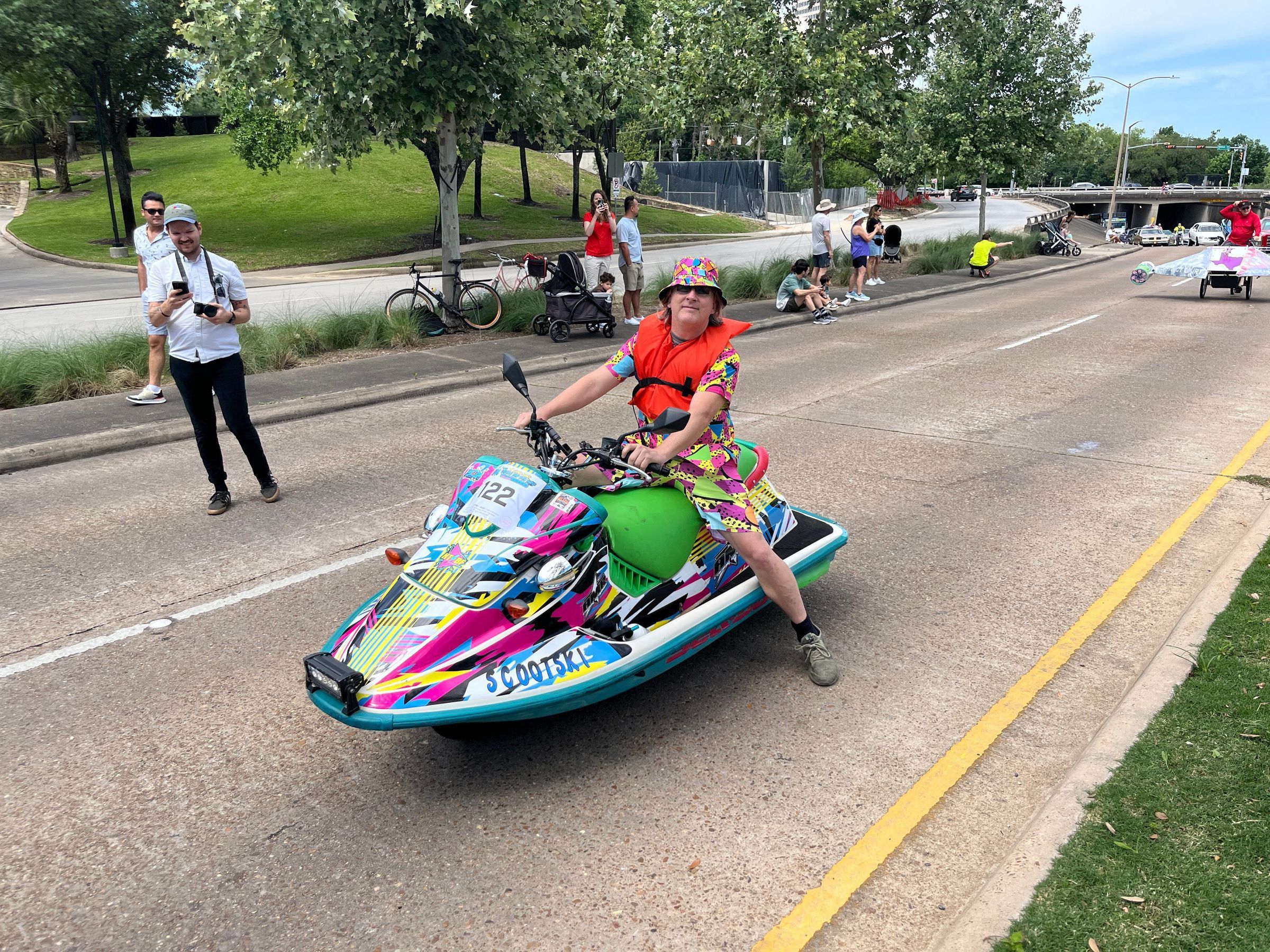 I have been a fan of cars and pretty much anything that is motorized all of my life and when I saw the scoot-ski concept I knew I had to have one. I contacted a friend and soon after had a working prototype and was riding the streets of Lufkin. When I saw a video of the artcar parade I thought to myself “how great would it be to drive my scootski in it and put a smile on the people watching”. Everyone who sees the vehicle loves it and have more questions than you can imagine.