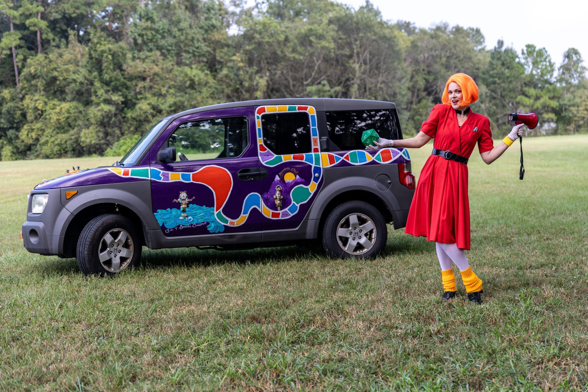 "Nichole Hamilton (Dame Dada) is an Associate Professor of Theatre Arts at New Mexico State University whose research interests include performing and directing new works, farce, satire, and exploring devised and experimental forms of theatre. Nichole has been performing Dame Dada since 2014 and was compelled to create this large prop that can be used theatrically wherever she travels. Camping with Art Car Camp at Burning Man, she was consistently inspired by friends' imagination manifested into an motion. After a few years of daydreaming, she created this as an homage to Dadaism, participation, and play.