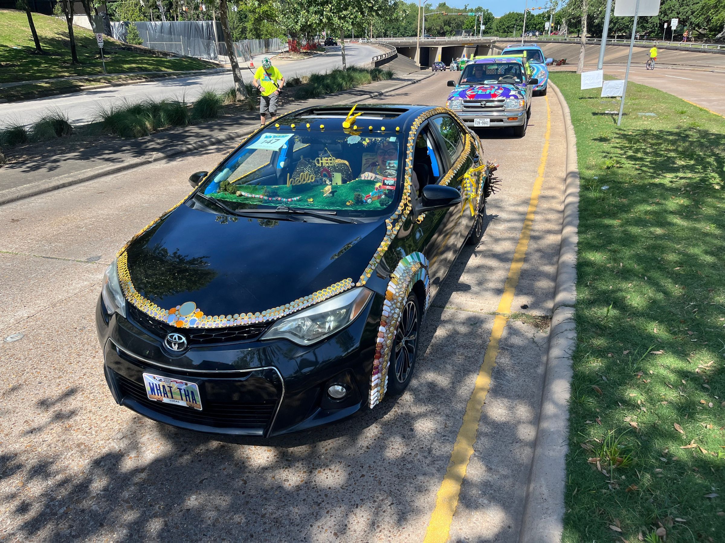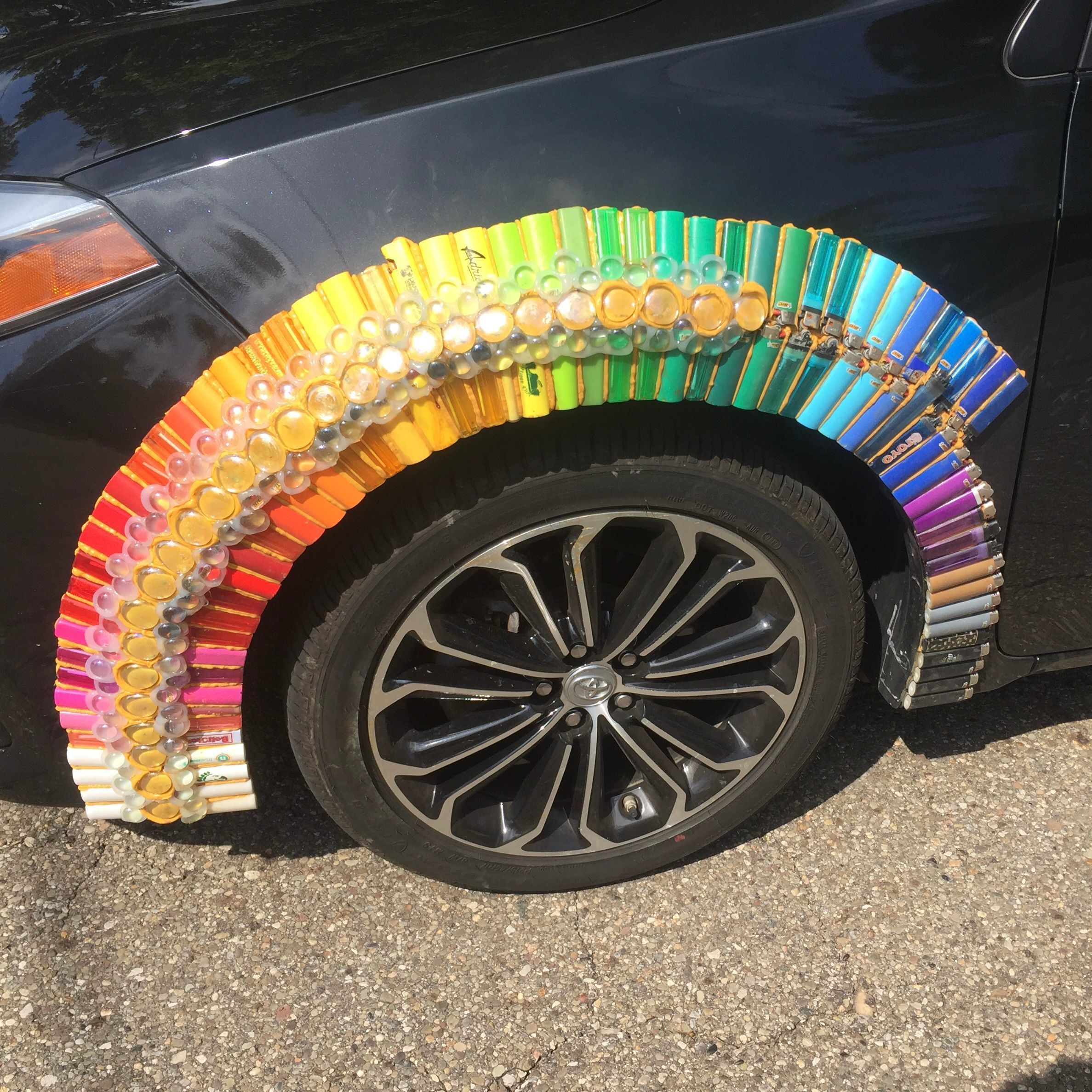 While some like to hide their glue on their art projects, Cari uses the yellow silicone as part of her design element purposefully pushing it out and slowing turning the car yellow as she adds to the outside surfaces. While Cari is a lover of all colors, especially the bright bold ones, yellow is her absolute favorite and main color choice in the overall design concept, however rainbows have a great representation as well.