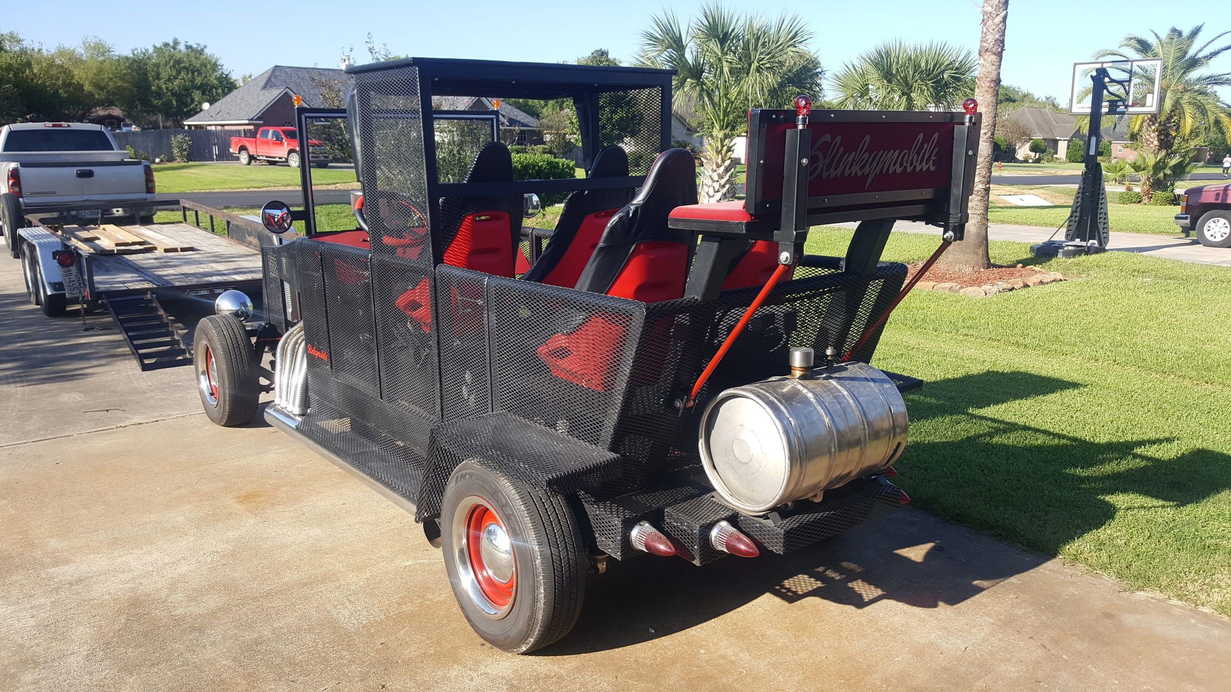 I got the inspiration to build the Slinky Mobile from the style of the Munsters Mobile. I used expanded metal, flat tubing, 454 Chevrolet motor and a beer keg for the gas tank. It has been a work in progress for the last 9 years.