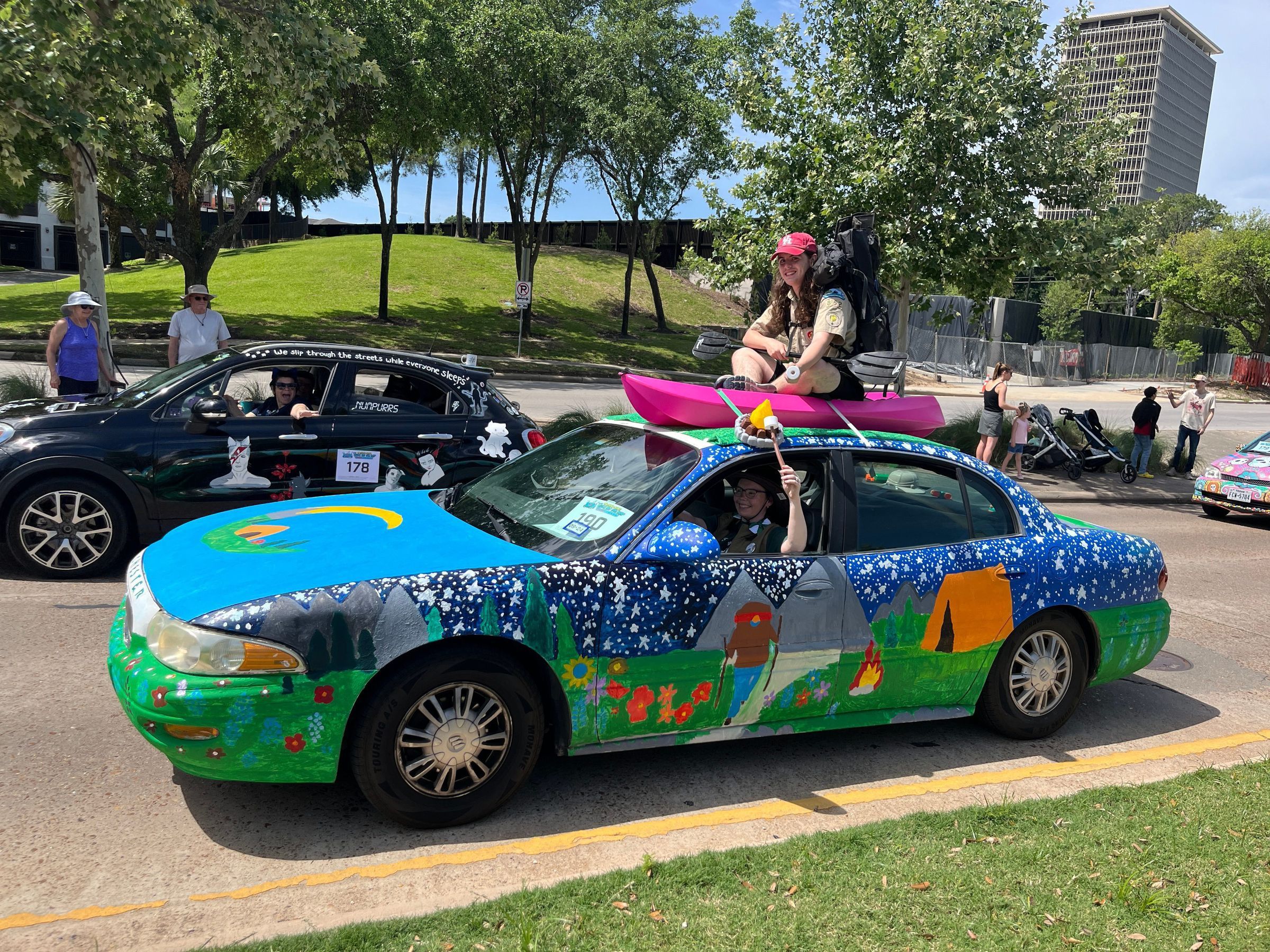 Wilchester Elementary 5th grade artists, from Spring Branch ISD, are "moving mountains", making strides and leaving their marks on the world around them each and every day! This year's school theme was a camping theme with "Adventure Awaits" as their motto. 5th graders work together for about two weeks on this car during their regular art class with every 5th grader getting to participate. This year they have tied their art car painting with the camping theme. Their Art teacher, Mrs. Walton, has sponsored a car in the parade since 2013 and this particular car has about 7 layers of paint on it! Riding in the car are 3 of her 5th grade artists who won their spots through a drawing! So fun!