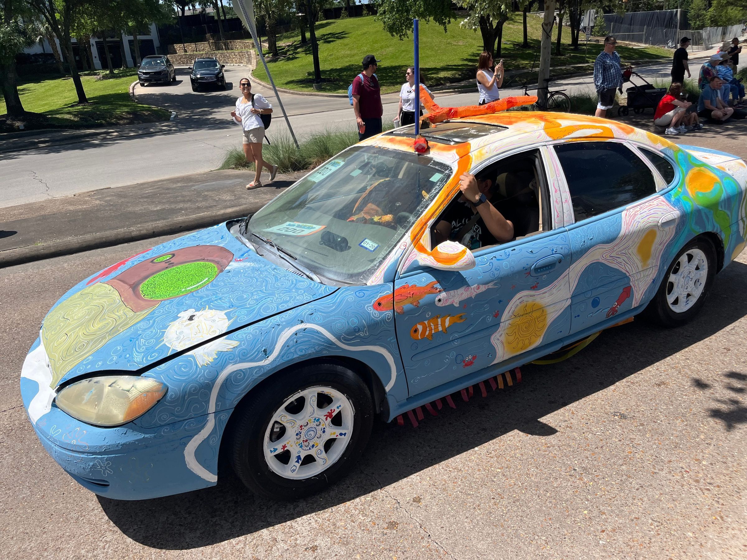 Earlier in the school year, many of our Art Club members participated in a beach clean up. Students enjoyed the opportunity to engage in our community and tackle a large environmental problem in a small but real and physical way. Inspired by this event, they decided to make an ocean-themed art car for this year's parade. Students chose to feature a large octopus made of styrofoam on top of the car because they appreciate the unique form and intelligence of this sea creature. Duct tape, spray paint, and paint pens helped students to complete their vision.