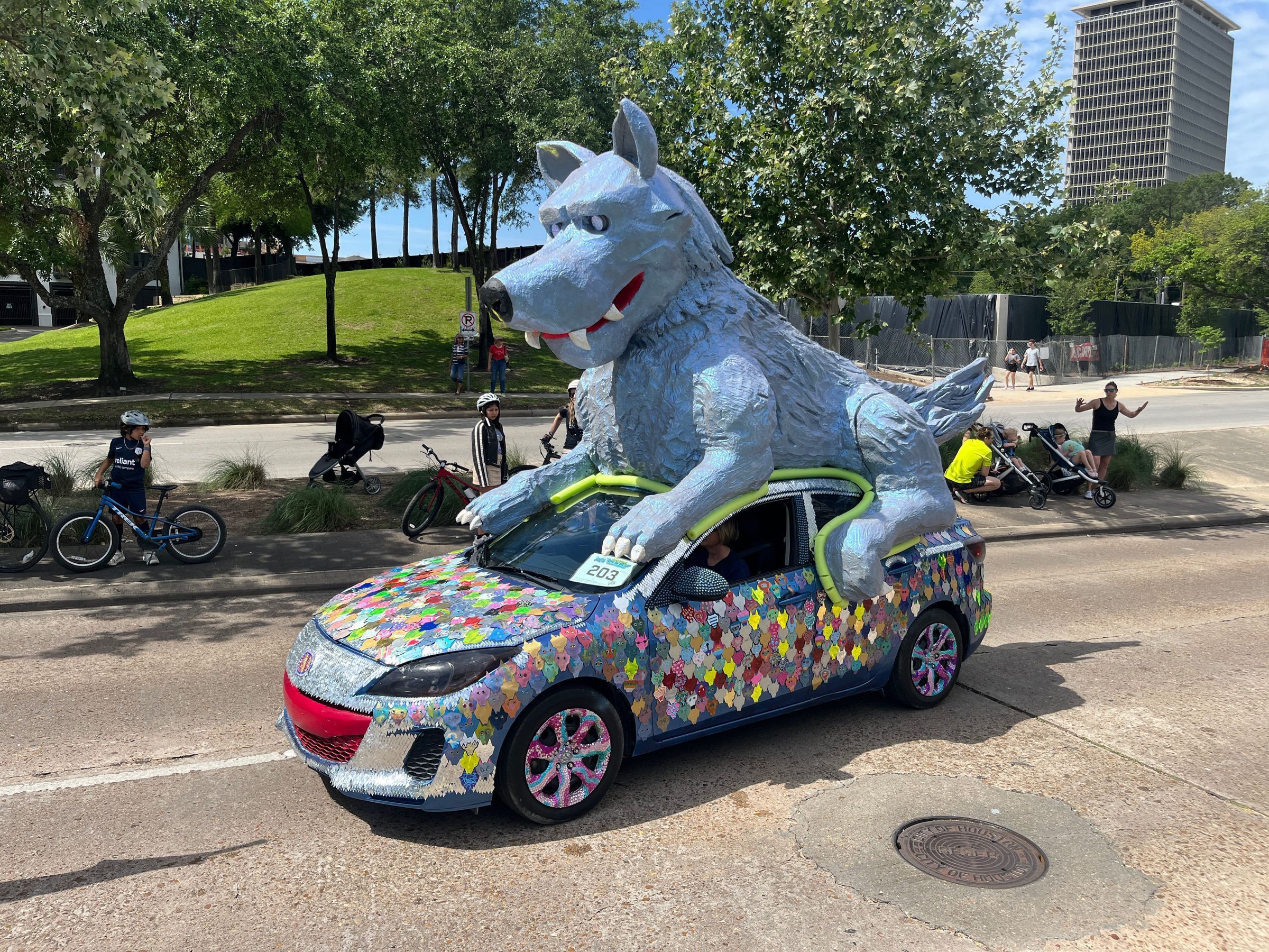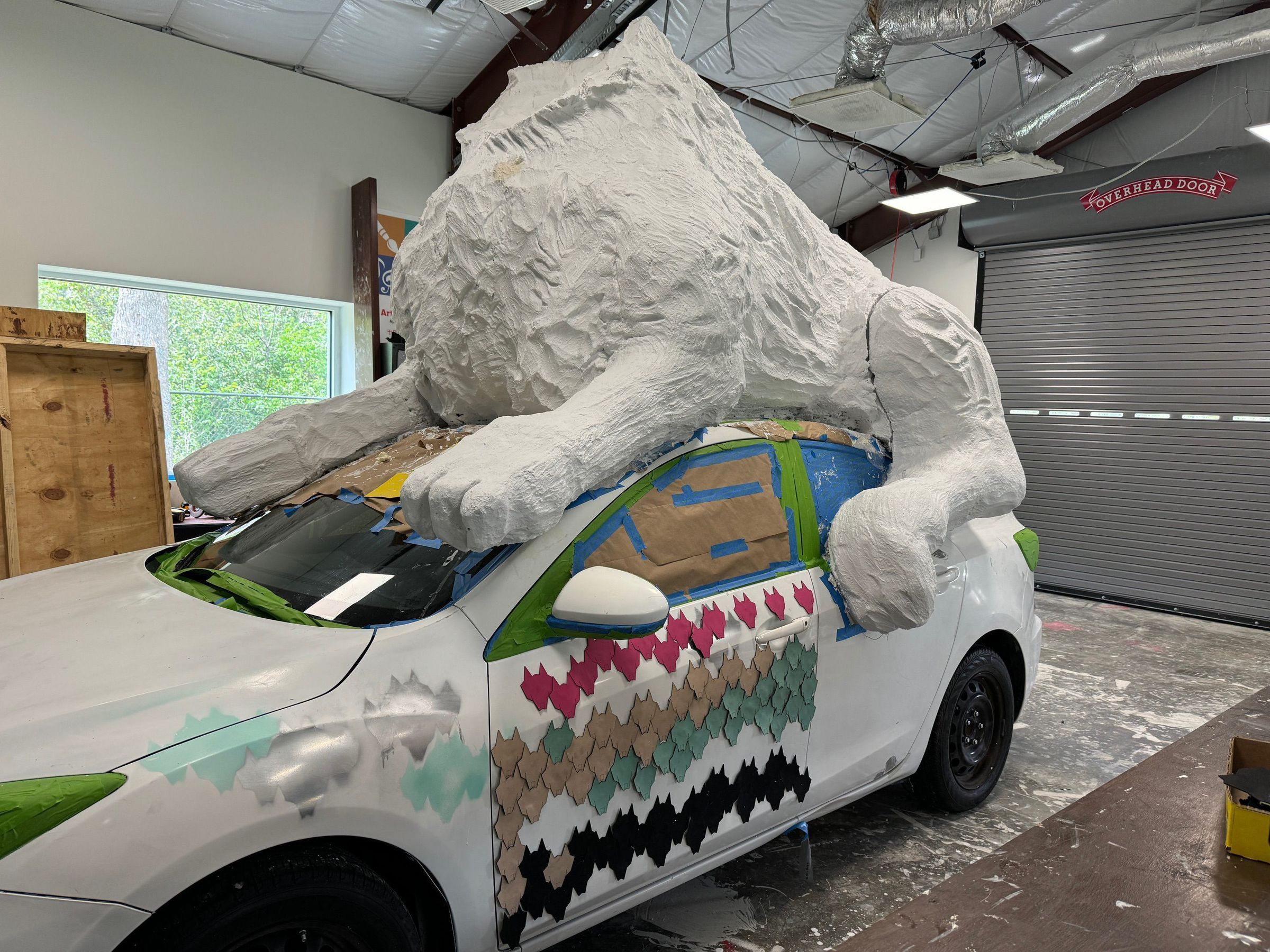 Toyota Echo transformed into a wolf mounted on top carved out of styrofoam with stucco coating and paint. Smaller styrofoam wofves running along the sides of car with a tessellation of wolf heads on the sides finish the design. Our car was donated by Sonic Automotive.
