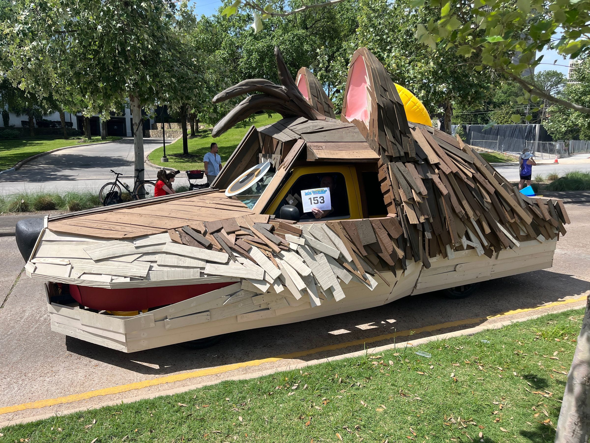 In celebration of the soon-to-open Great Wolf Lodge in Webster, TX later this year, our first-ever entry reflects some of the fun families will have at our indoor water park resort. Our Art Car entry features one of our iconic characters, Wiley the Wolf, in the front of the car and the back reflects some of the adventures families will have in our indoor water park. The artcar is built on a pick-up truck: the cab is a larger-than-life rendition of Wiley the Wolf’s head, in the bed of the truck the family fun in our water park with an actual slide. We have partnered with Rootlab, a local exhibition design & fabrication team to help us bring our entry to life. They are a diverse group of artists, fabricators, designers and engineers located in the heart of Houston, Texas. We were inspired by their passion, pride and expertise, and are excited to collaborate with this local group to make a splash at the 2024 Art Car Parade! The materials used in construction include ESP foam, wood, acrylic, inflatables and paint.