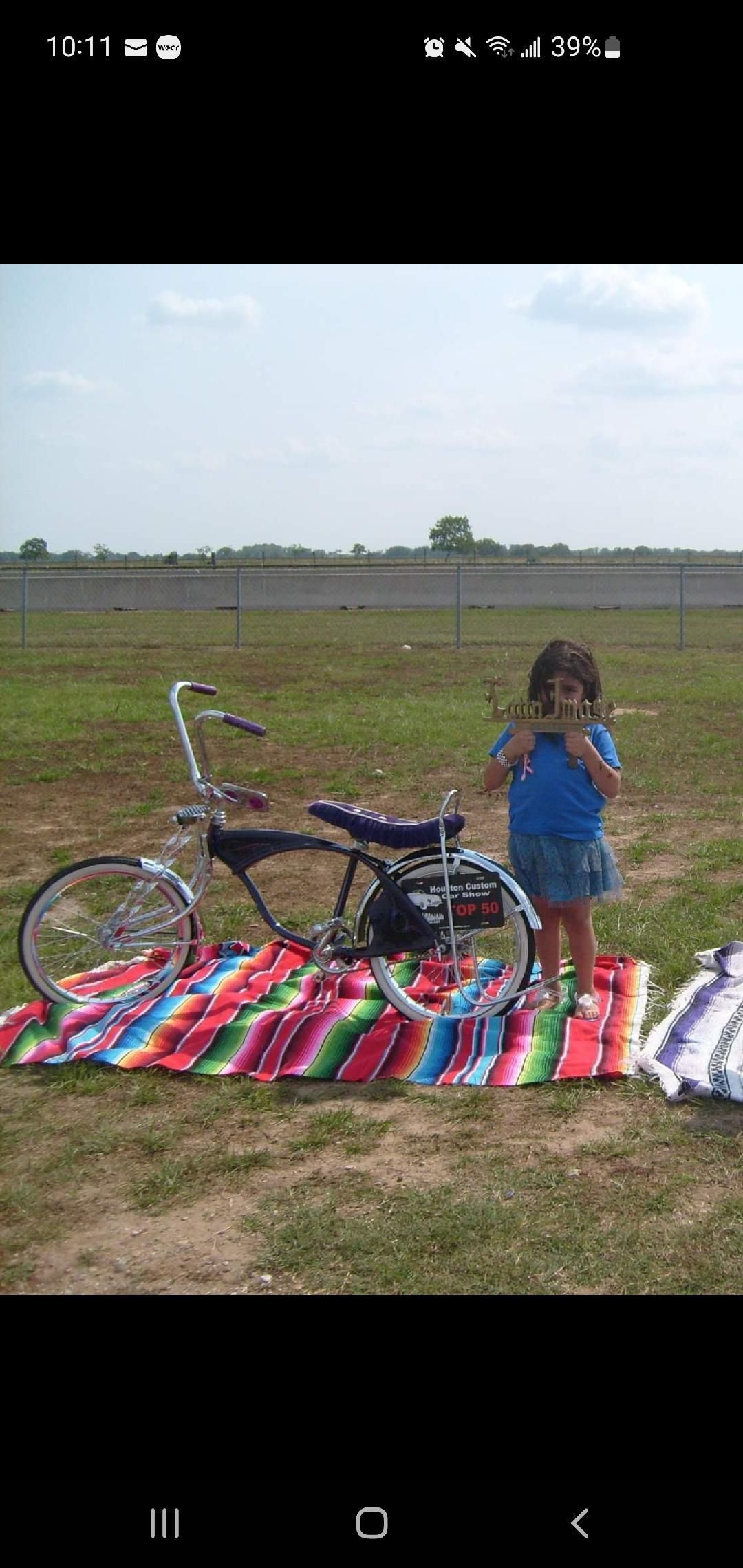a Schwinn bike with a custom purple paint job and pink pinstripes. chrome plated and crushed velvet seat.