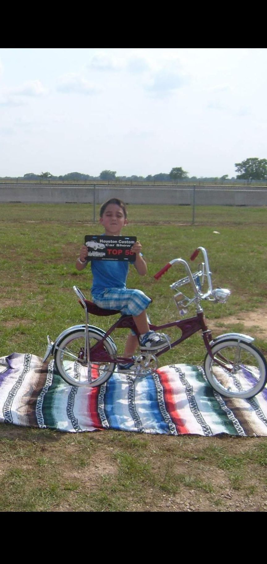 A lowrider bike with custom candy apple red paint job with pink and purple pinstripes and chrome plated