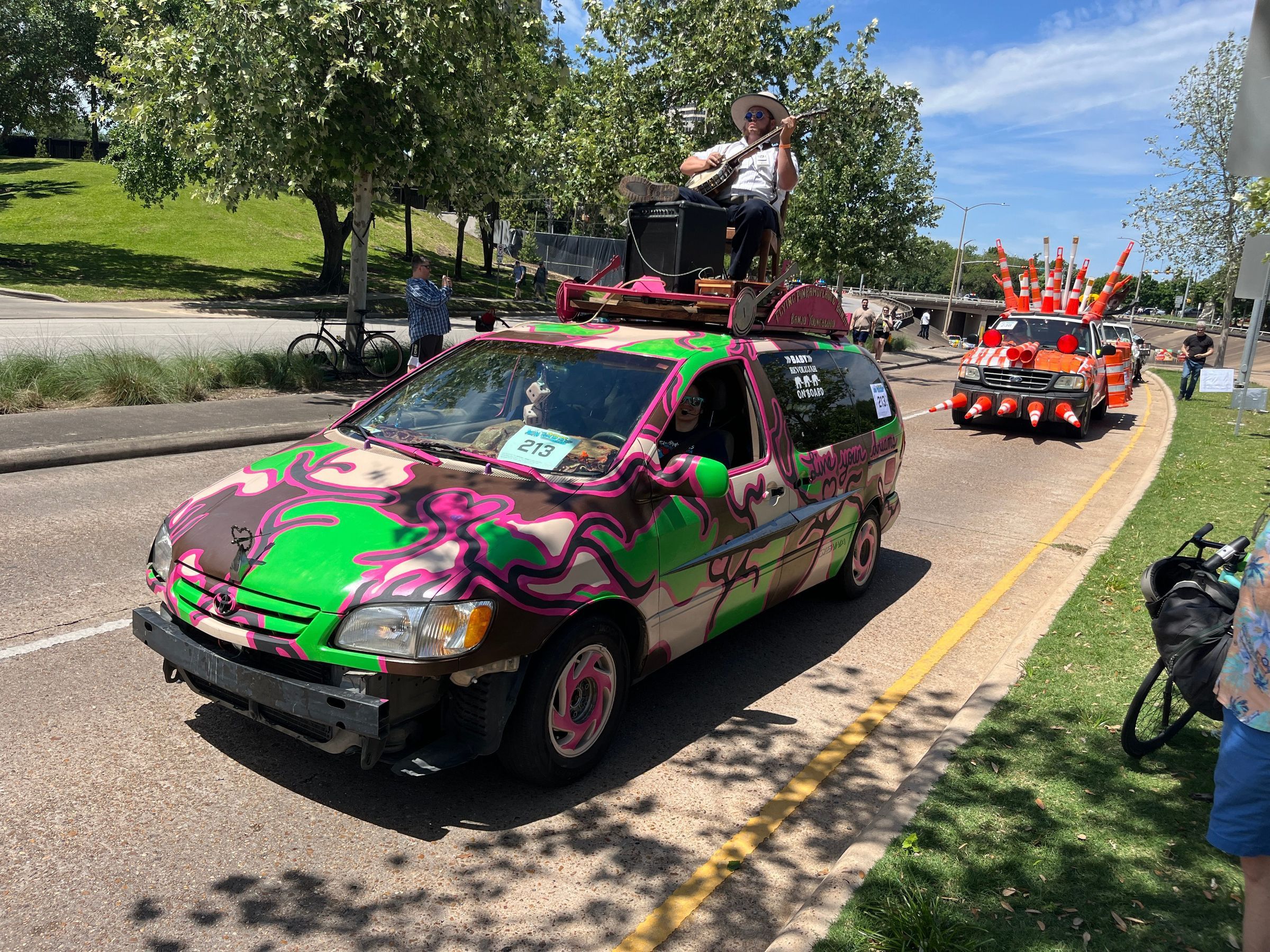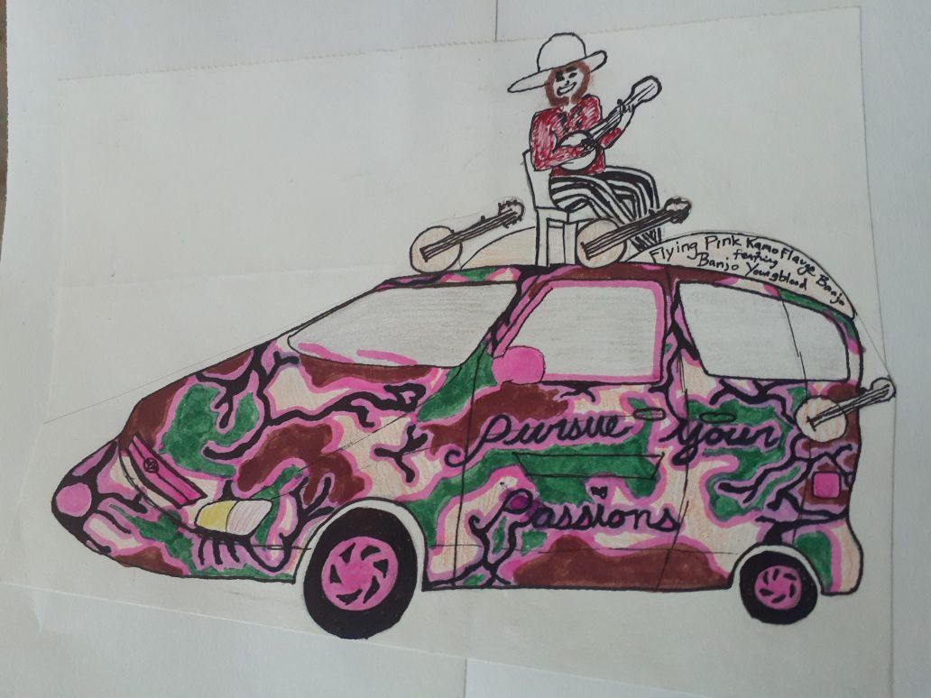 The Youngbloods spend their lives traveling the country in pursuit of their passions, encouraging others to do the same. The Flying Pinkamoflauge Banjo is a rendition of their 2022 winner for the Music award in the Houston Parade, The Flying Kamoflauge Banjo. This van is a symbol of the individuals within the Youngblood family as one whole unit. The banjos welded on represent the father, Friar Banjo "Like the Dog" Youngblood, one of the very first artcar kids of Houston, seen playing his banjo atop the van on one of the family's four mobile stages. The camouflage represents Banjo's bride, the mother of the Youngbloods, and artist of the paint work, Kaitlyn "Kamo" Youngblood. The flying aspect of the vehicle comes from the wings and tailfins on the van which represent the talented and daring young Jethro "Jet" and the pink is for the youngest member of the family, Ms. Jazzlyn.