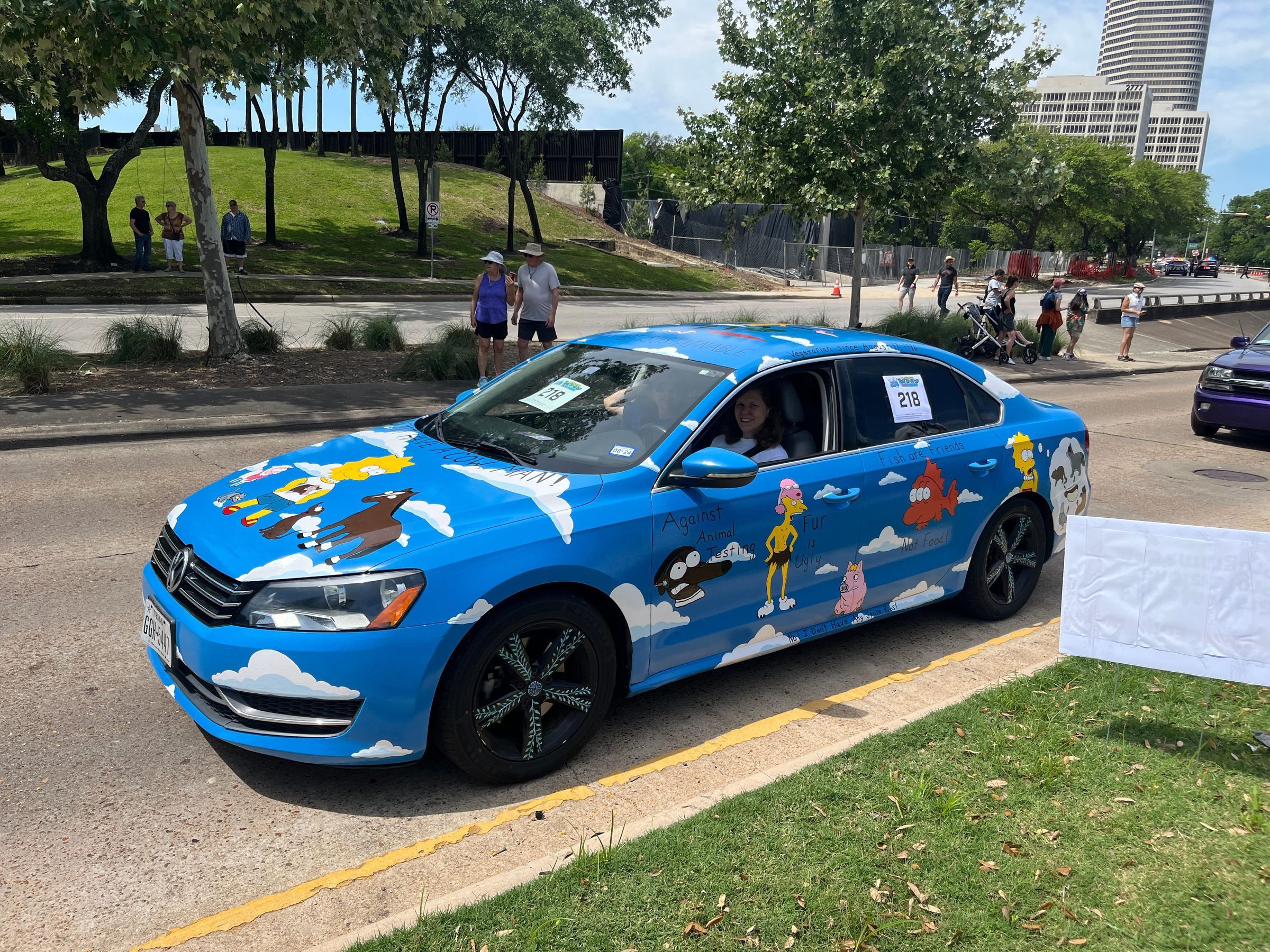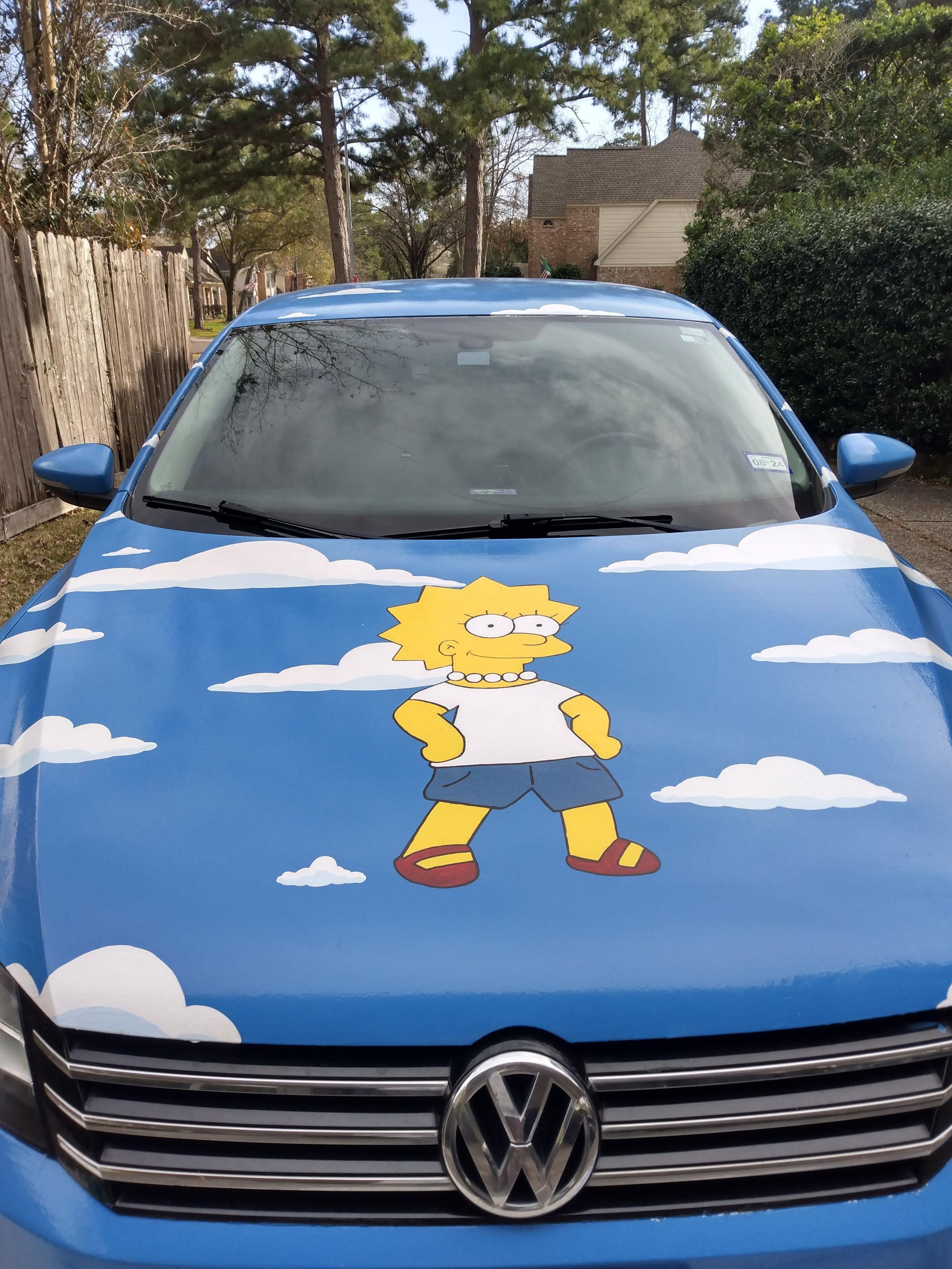 My art car promotes Animal Rights as presented by the Simpsons. Lisa, the vegetarian, is the star of the car, of course. But also featured are Mr. Burns' grizzly bear underwear, Blinky the 3-eyed fish, and Santa's Little Helper who was rescued from a dog track. Using only paint on my car, I hope to convey that animals are not ours for food, clothing, or entertainment.