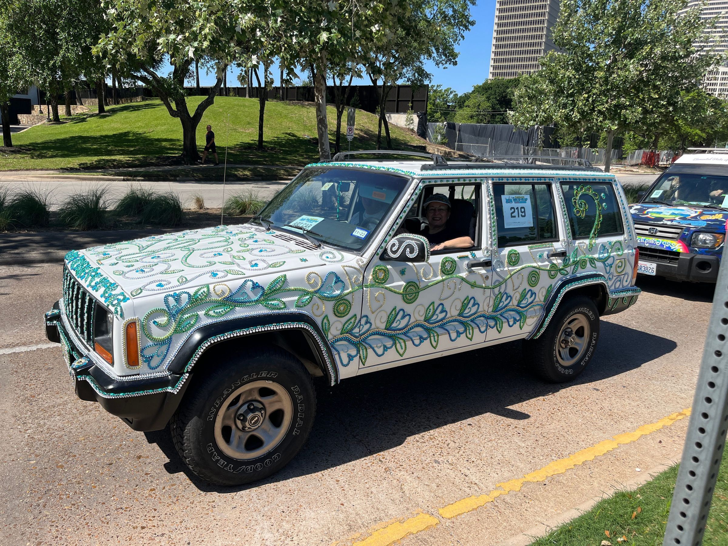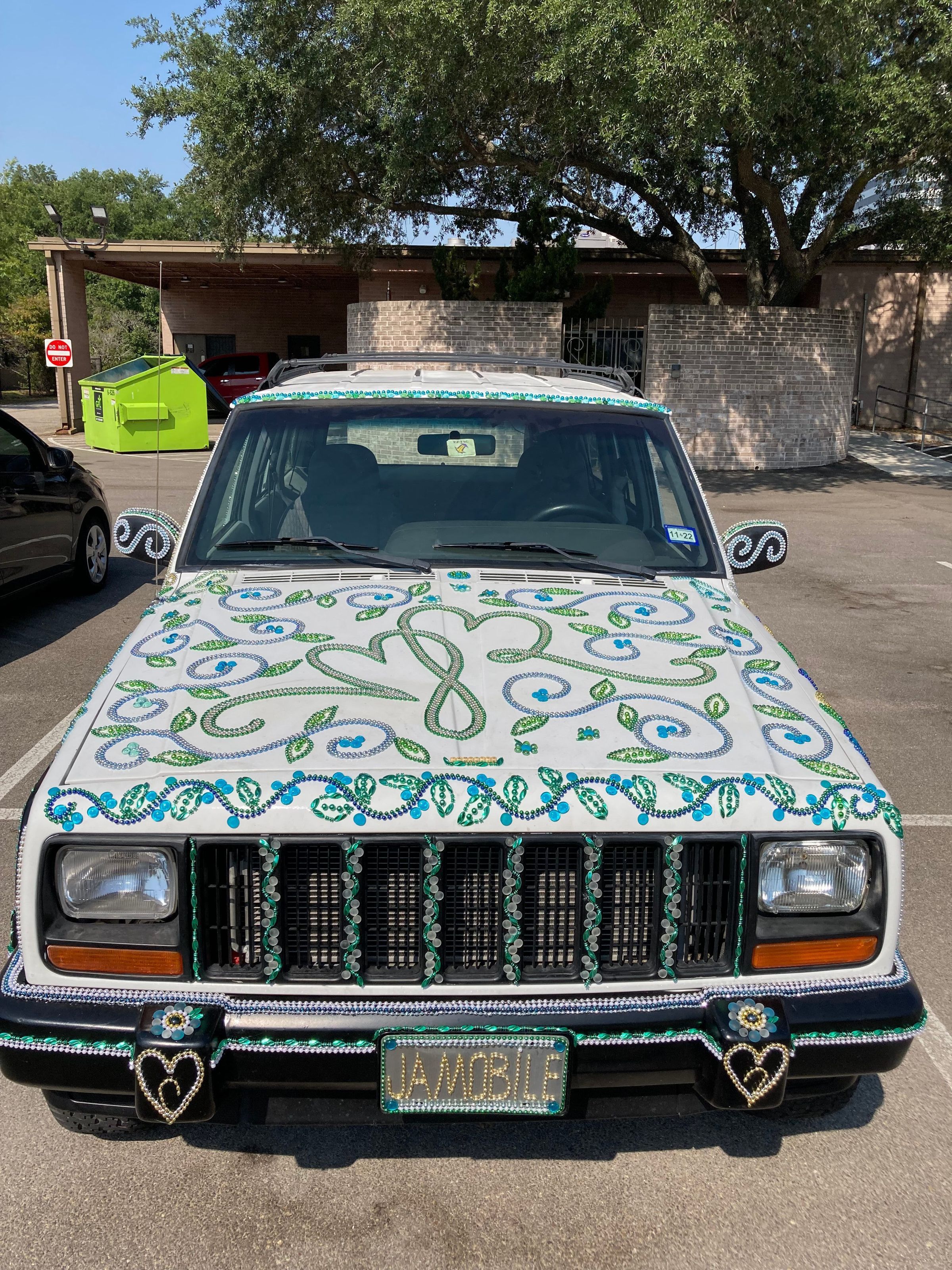 1998 white Jeep Cherokee Sport, with blue, green, white, gold and silver party beads glued on with E6000. Kind of a musical theme.