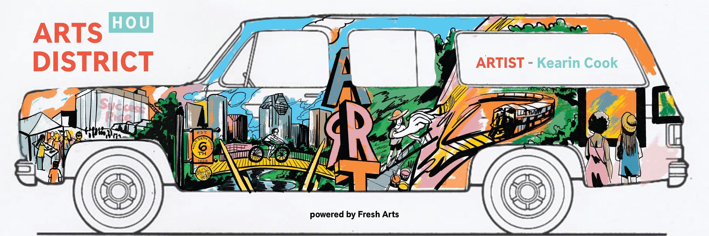 In celebration of a decade as a state-designated cultural district, this car embodies a vibrant tapestry of wonders and attractions! Notice the distinctive icons that make the Arts District such a unique place to visit including: the rice silos, the historic architecture, Buffalo Bayou Park and its public sculptures.
