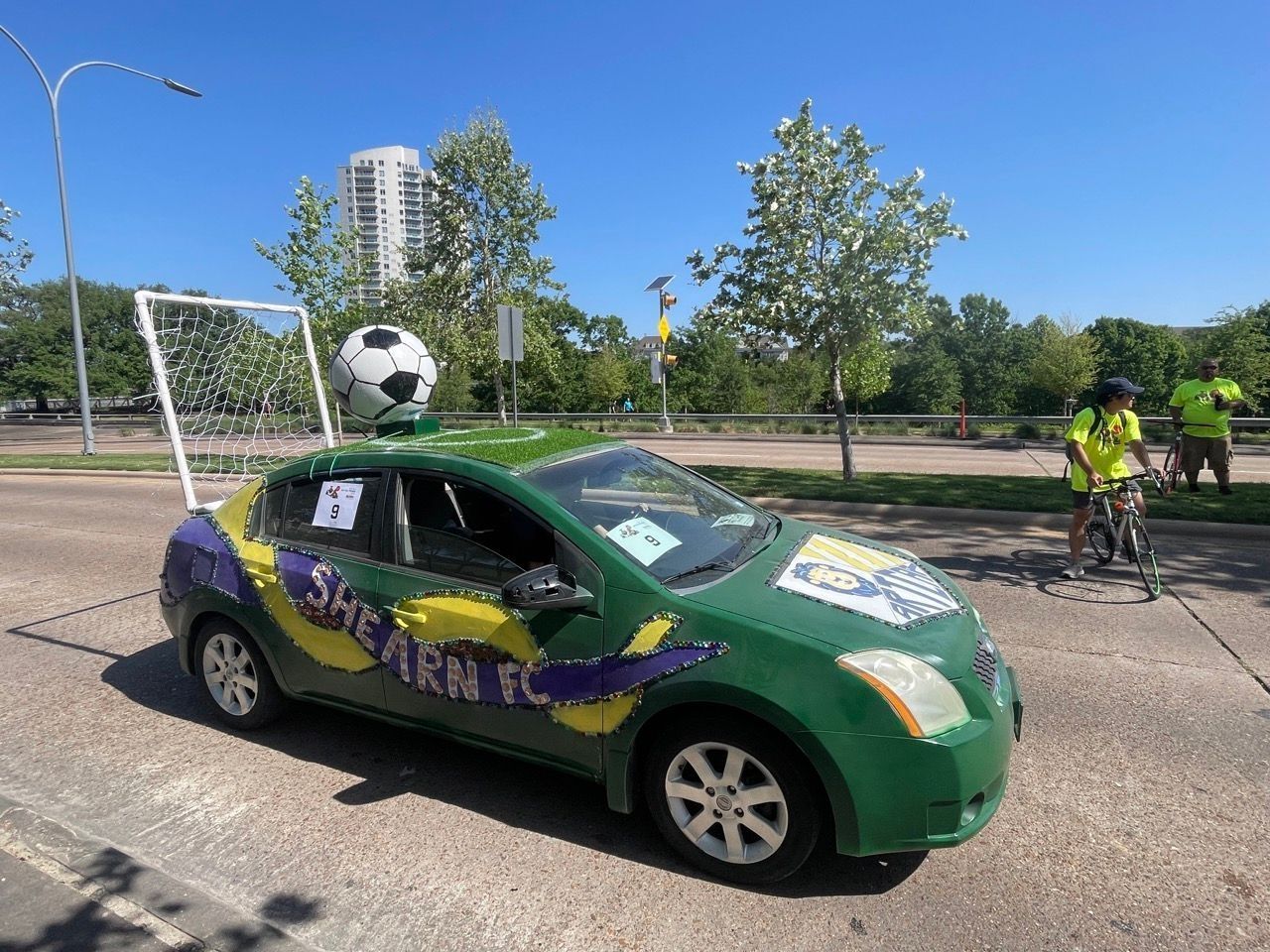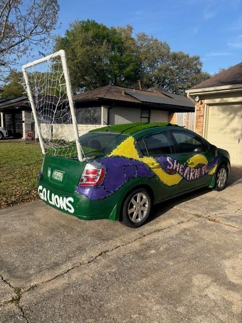 ---- The Shearn FC car represents the creativity and passion of the students at Shearn Elementary. Students collaborated to create an interactive soccer car, blending a soccer field with school pride! Students painted and collaged a variety of materials, such as jewelry and stones and attached some soccer essentials!---- I have been teaching art at Shearn Elementary for 7 years and I have always enjoyed introducing my students to new forms of art. Houston has such wonderful, creative community and I like to remind them art is all around them. I have been doing Art Bike for the past four year and we felt like it was time to participate in the Art Car Parade!