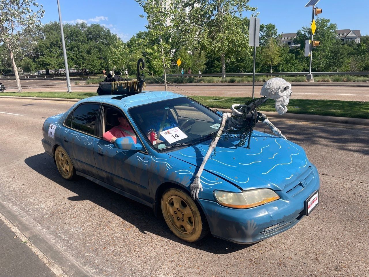 ---- "In the Styx" is based off the Greek Myth of the River Styx. On the car, you will find a river scene of the dead reaching from the bottom of the car (or river) up to Charon's ferry, trying to board to get to the afterlife. The car is shades of blue representing the water. You will find 3D trees built on the sides that will cover some of the car to invite the viewers in. On the roof, you will see Charon in his ferry holding a chain that is connected to a large skeleton on the hood of the car, pulling his ferry across. There are also multiple skeletons climbing up the car to get to the ferry. We hope to also have the rims painted like gold Obol's that will give safe passage to the after life.---- Spring Branch ISD teachers LOVE art cars! I have been inspired by artists Becky Mustachio and Stephanie Walton for my 9 years in the district. I have attempted an art car in the past, but it didn't work out. An opportunity arose for Northbrook High School to receive a donated car and we jumped at the opportunity. This will be the first time NHS has created a car! We are very excited. This year's entry was inspired by skulls. I knew I wanted to do something with skulls and inspiration hit, the river of the dead. I am most excited to show off the car that my students worked so hard on and see them participate in the parade.