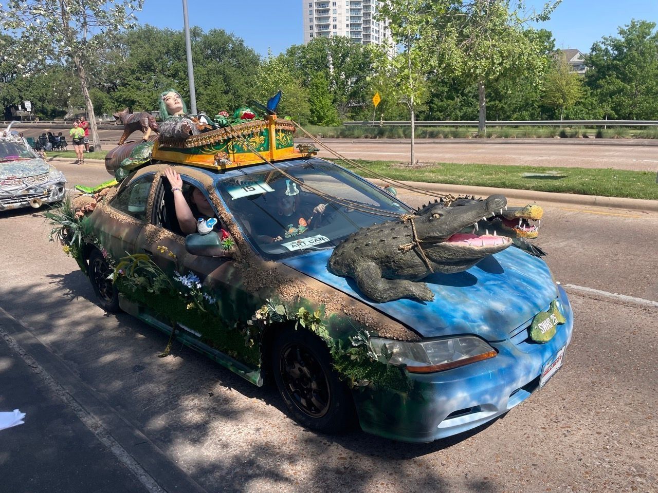 ---- Our theme is meant to evoke the enchanting nature of our beautiful city. A flowing body of water courses across the center of our car surrounded by swampy shores. Three goddesses sit atop the vehicle being pulled on their swampy chariot by 2 gators on the hood.---- I have wanted to create an art car since before I started teaching , 17 years ago. I convinced my first principal to let me make a daily driver with my elementary students 13 years ago, but she felt the parade was too liberal and refused to let me make one again. I briefly worked in HISD last year at GOMM where an amazing PTO were already Art Car supporters and so I designed and created a collaborative car with 750+ students using recycled materials. This year I returned to Spring Branch ISD at Spring Woods High School and was given a car from Gillman to build our masterpiece. Let the sculptural masterpiece begin!