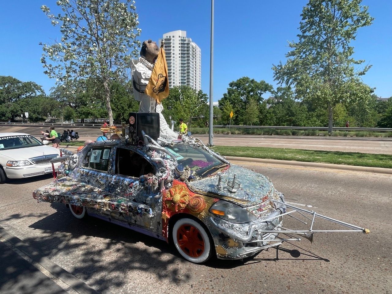 Put more stuff on it - 2024 Westbury HS---- This art car was donated by team gilman last year and this year we are recreating the art car. Hastings High School Bears and Ms. Tarkington are using NASA and space as an inspiration for the design. The form of the rocket has been carved out of foam and found objects such as jewelry and old glass vases have been given new life for the surface design. Hastings High School art students are ready for lift off!---- The story of this art car begins with Ms. Tarkington's dream to one day build an art car with students. Last year team gilman donated this nissan versa to her and her students at Westbury High School and now with Ms. Tarkington at a new school, Hastings High School she is proud to represent the school with an art car.