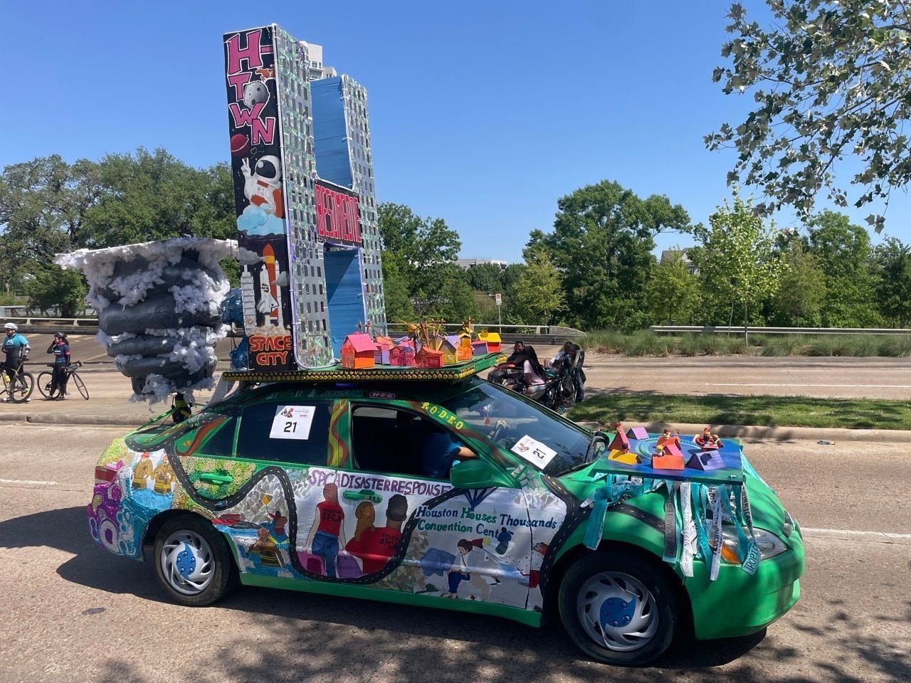 ---- Our Houston Strong car is inspired by the community and strength we see amidst Houston’s stormiest seasons. With beaded stories of restoration, we hope to show boast and power in lifting others up during times of need. The car features aluminum skyscrapers with the “Be Yourself” bridge between the two, forming the shape of an “H” for H-town. Houston towers over the spinning hurricane beneath it on the trunk of the car, with ribbons naming every deadly hurricane that has hit our city since 1989. On the hood of the car is a boat that goes around the city, helping people in different scenes of the flooded Houston area. This showcases the first responders that dedicated weeks to aid in Houston’s recovery.---- We are a team of very passionate high school students from Bellaire! Although we all have different interests (robotics, soccer, swim, debate, etc.), all of us have been impacted by the natural disasters of Houston — namely hurricanes and especially hurricane Harvey from 2017. Many of us had to move temporarily, host family and friends, or rebuild our homes. Whether it be a hurricane snowstorm in our home town or fires across the country, we want to encourage and inspire others to give when possible and thank the people who work to keep our communities intact. This year, we are most excited about the Art Car Sneak Peek. Not only are we able to get to know and interact with other art car artists, but we can spread the story of our car’s theme. Also, the Art Car Sneak Peek is one of the few events with low-lighting as the sun sets. During the nighttime, the LEDs inside of the ‘H’ building will shine through the windows and truly make the entire car come alive.